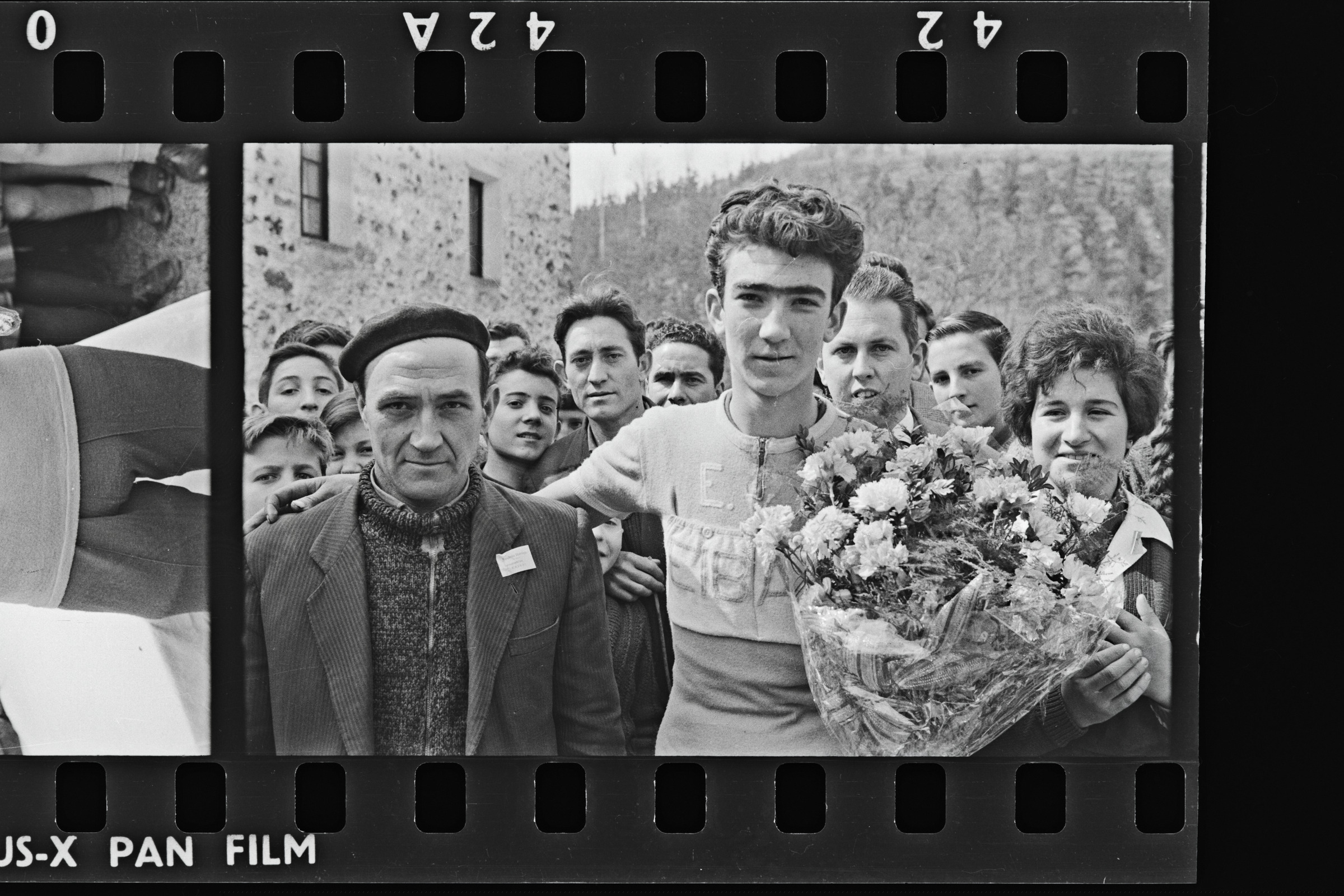 | El ciclista del Eibar E. y D. con un ramo de flores a la izquierda con un hombre rodeado de gente | Ciclismo. Anzuola. Segunda subida a Uzarraga. Vencedor: Malvar |