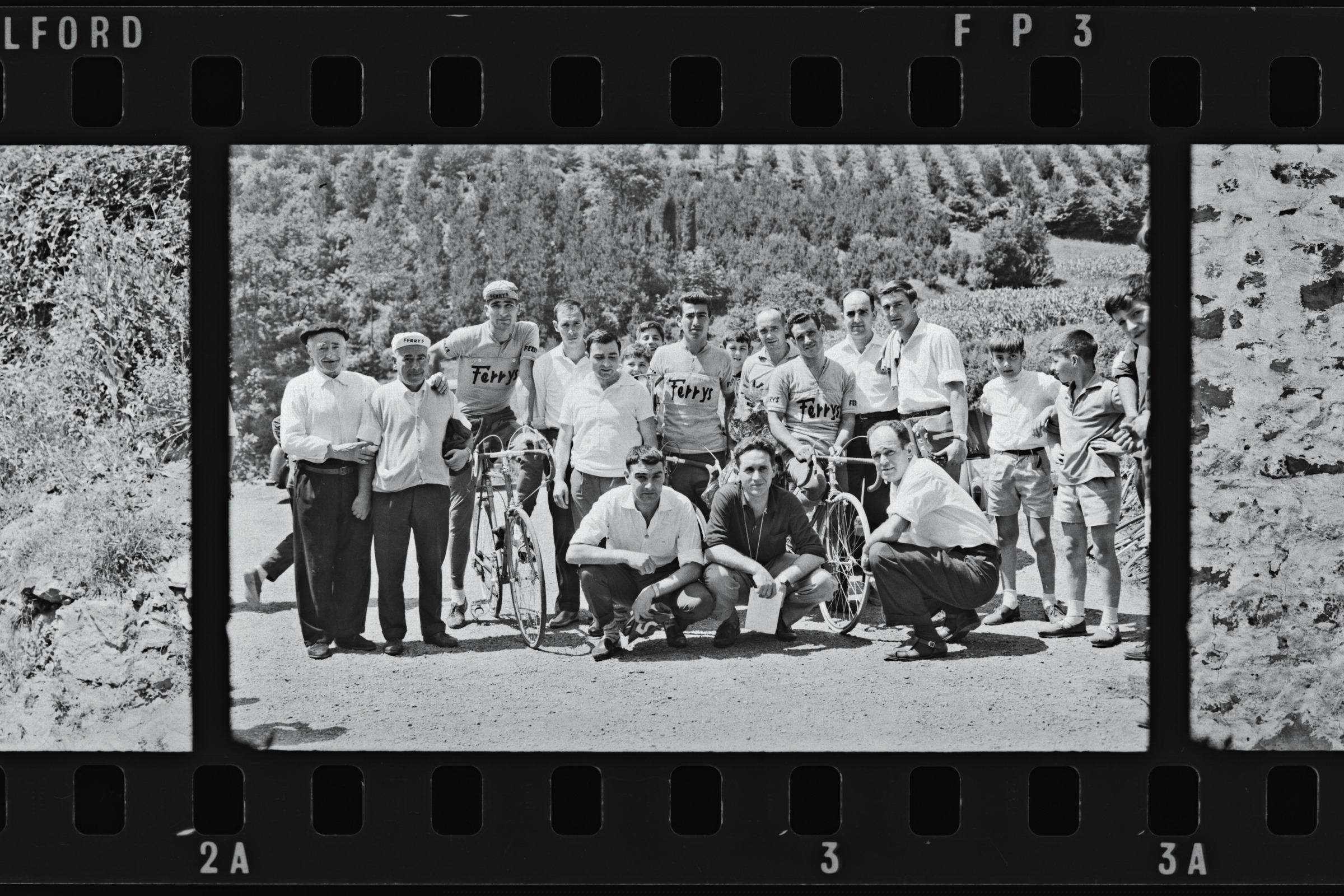 Grupo de hombres con el ciclista | Ciclismo. Anzuola. Tercera subida a Uzarraga. Vencedor: F. Marti |