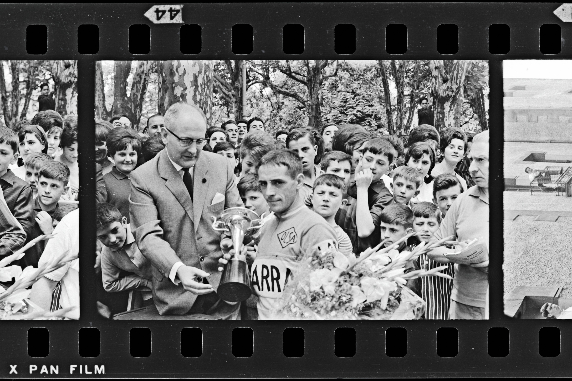 | Ciclista recogiendo la copa de la mano del alcalde | Ciclismo. Pascuas de Pentecostés. Vencedor: 17, 18 y 19 de mayo de 1964 |
