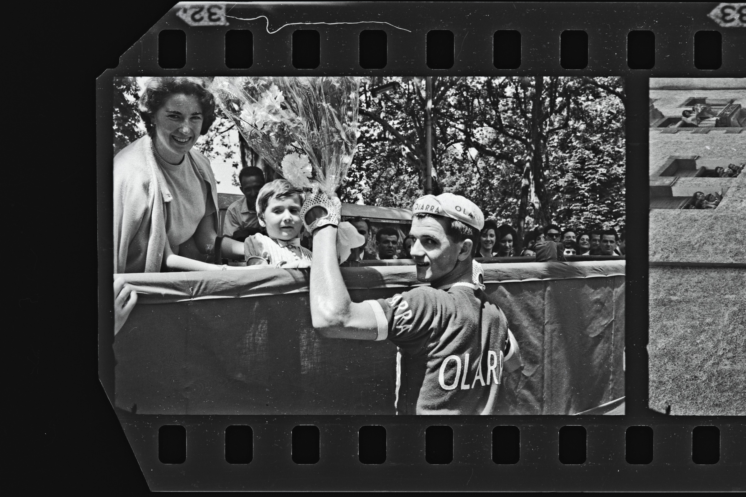 | El ciclista recogiendo un ramo de flores de manos de una niña en la tribuna | Ciclismo. Pascuas de Pentecostés. Vencedor: 17, 18 y 19 de mayo de 1964 |