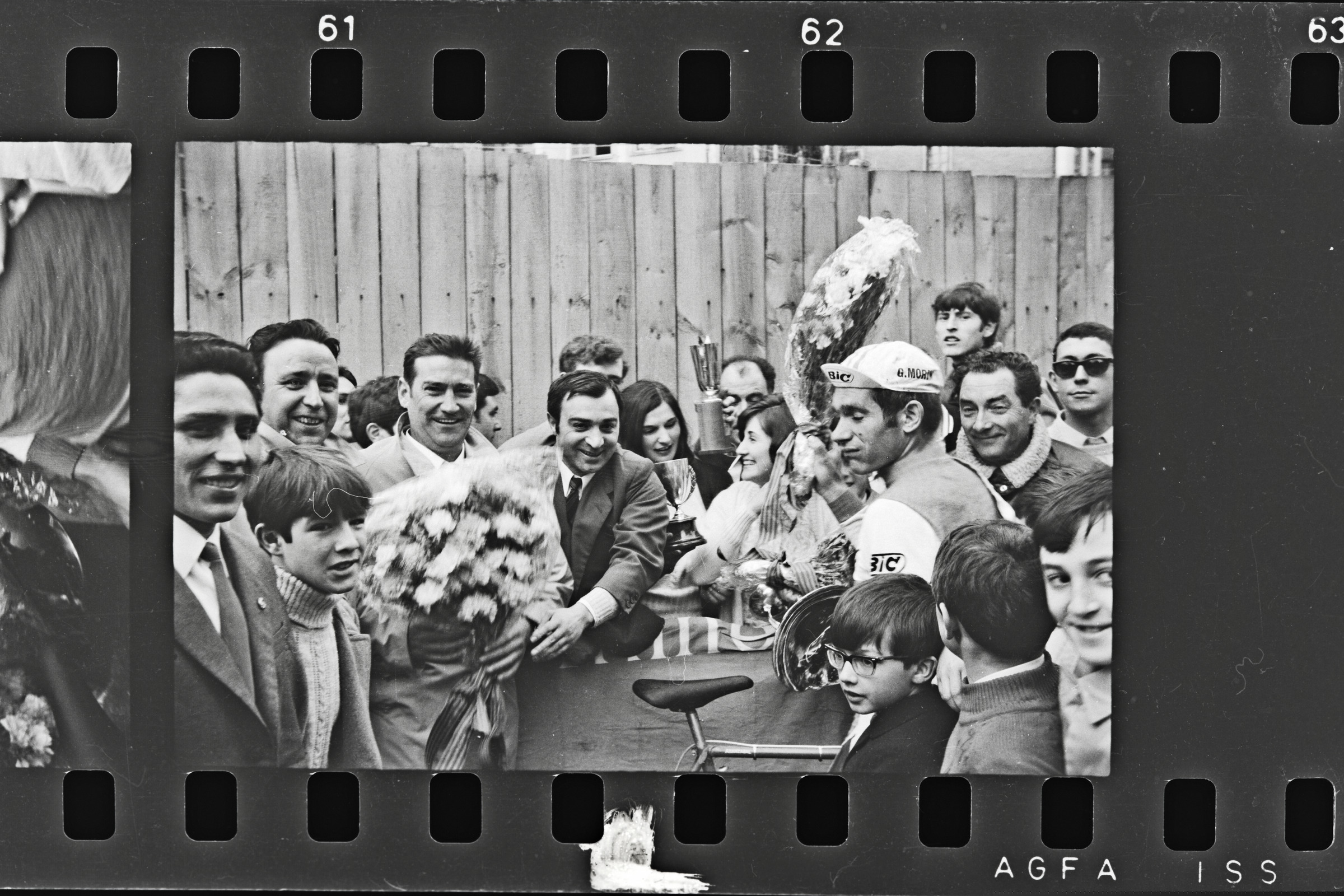 Ciclista del equipo BIC recogiendo la copa y el ramo de flores | J. Aranzabal ganador de etapa de la bicicleta eibarresa. |