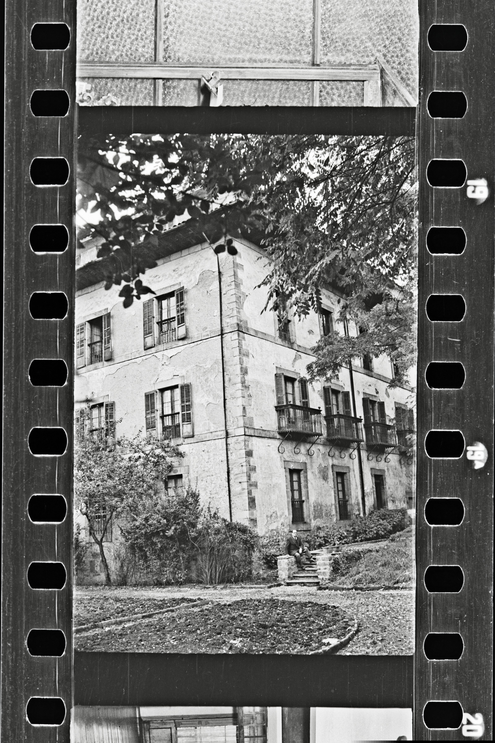 | Hombre en el jardín del palacio de Irizar; en segundo plano se pueden ver dos fachadas de la casa: las que dan al paseo de Irizar y a la calle Kruz Gallastegi | Interiores casa Irizar 1956 |