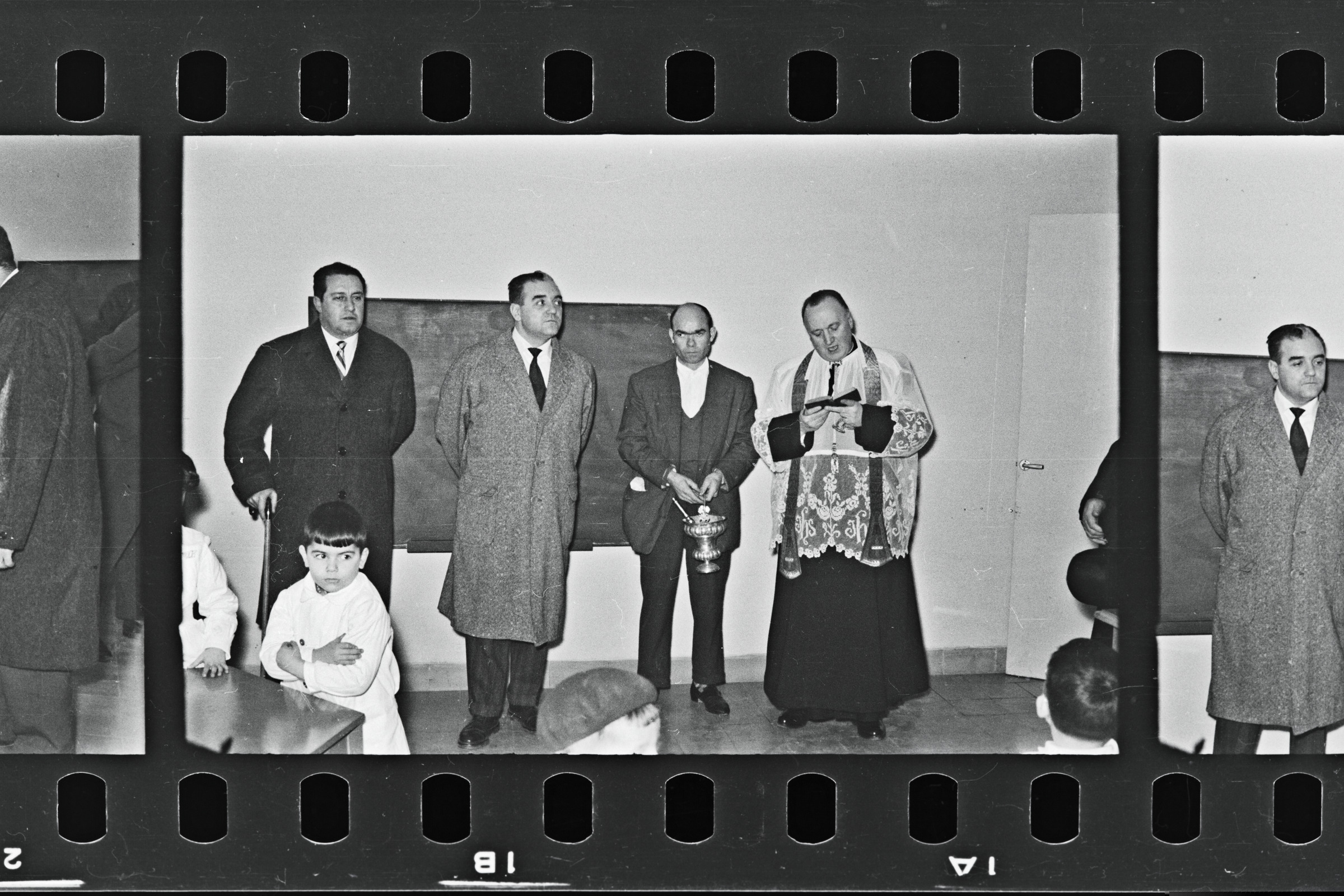 | Acto de inauguración y bendición de la escuela de Zubieta: niños y niñas sentados y la autoridad | Bendición escuelas abril- 1961 |