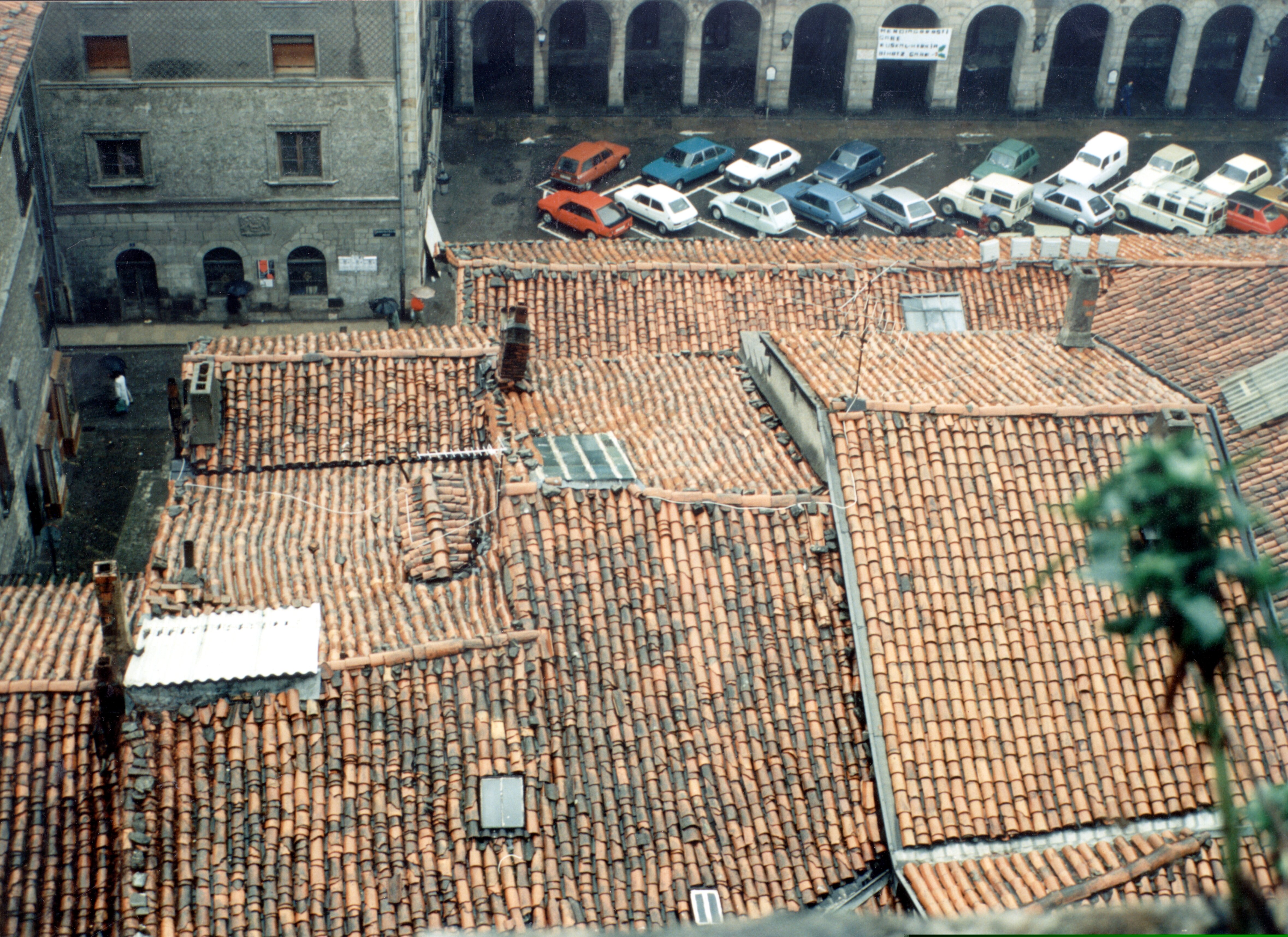 Antes de derribar los tejados de las casas de San Pedro 2. Vista desde el campanario de la iglesia de San Pedro; en lo alto de la fotografía la casa Jauregi, el pórtico del Seminario y el aparcamiento de la plaza San Martín de Aguirre. |