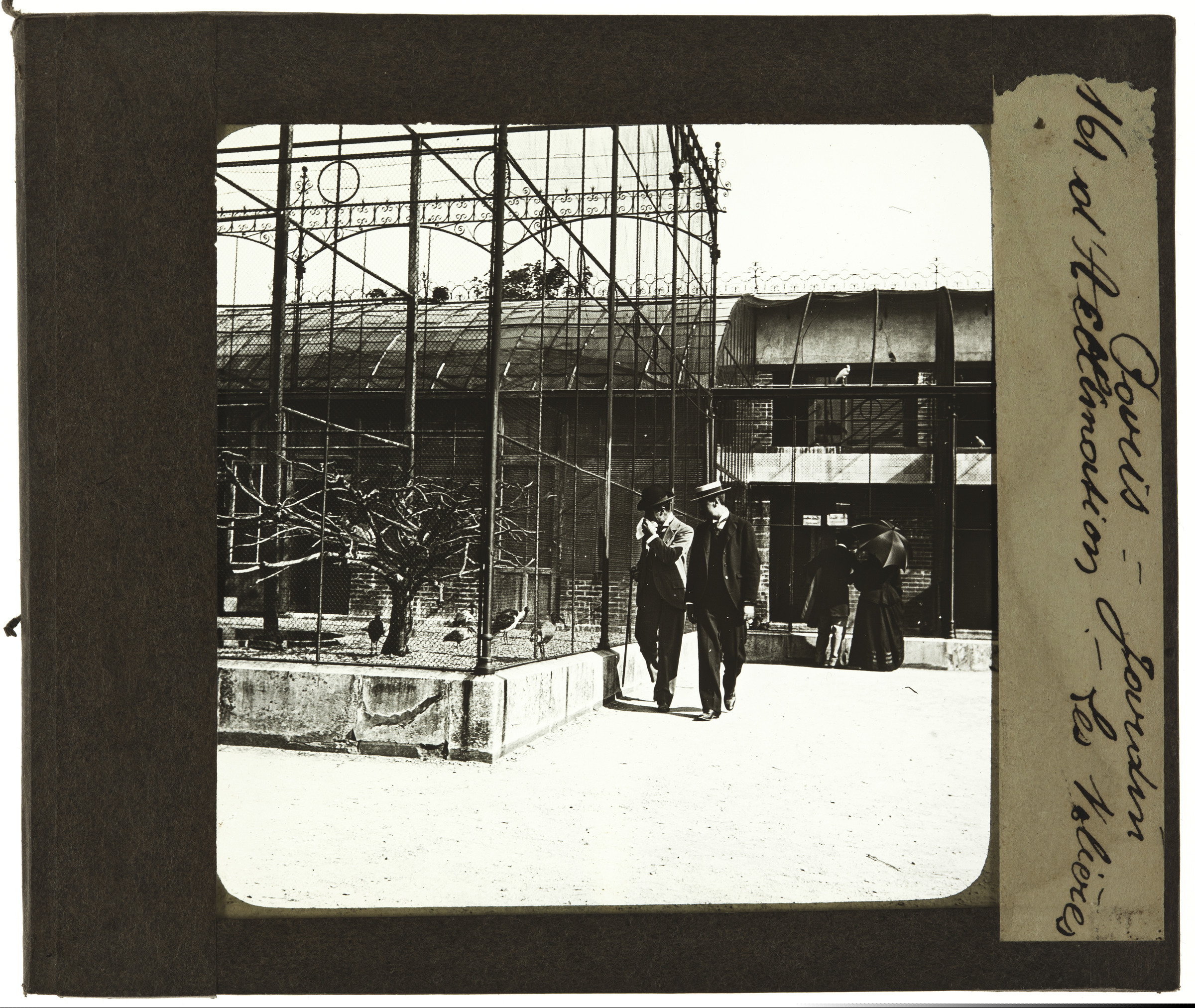 | En el parque Jardin d 'Acclimatation de París, dos hombres observando aves diferentes. | 161Paris. Jardin d ´Acclimanation. Les Volieres. [m.s.v.]. Vues et sujets divers pour Appareils de projection. J & A MOLTENI; PARIS Appareils de projection Fantasmagories Polyoramas [imp.r] |