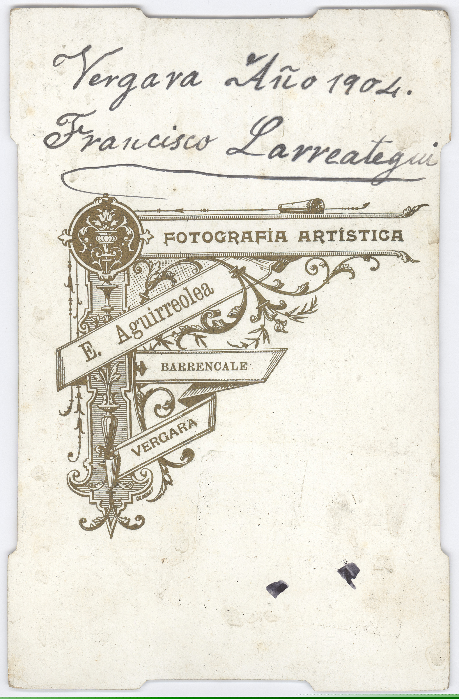 | Retrato de Francisco Larreategui | Vergara. Año1904. Francisco Larreategui. [m.s.v.] E. Aguirreolea, Barrencale Vergara. [imp.r.] Fotografía artística E. Aguirreolea Barrencale Vergara [imp.v.]. |