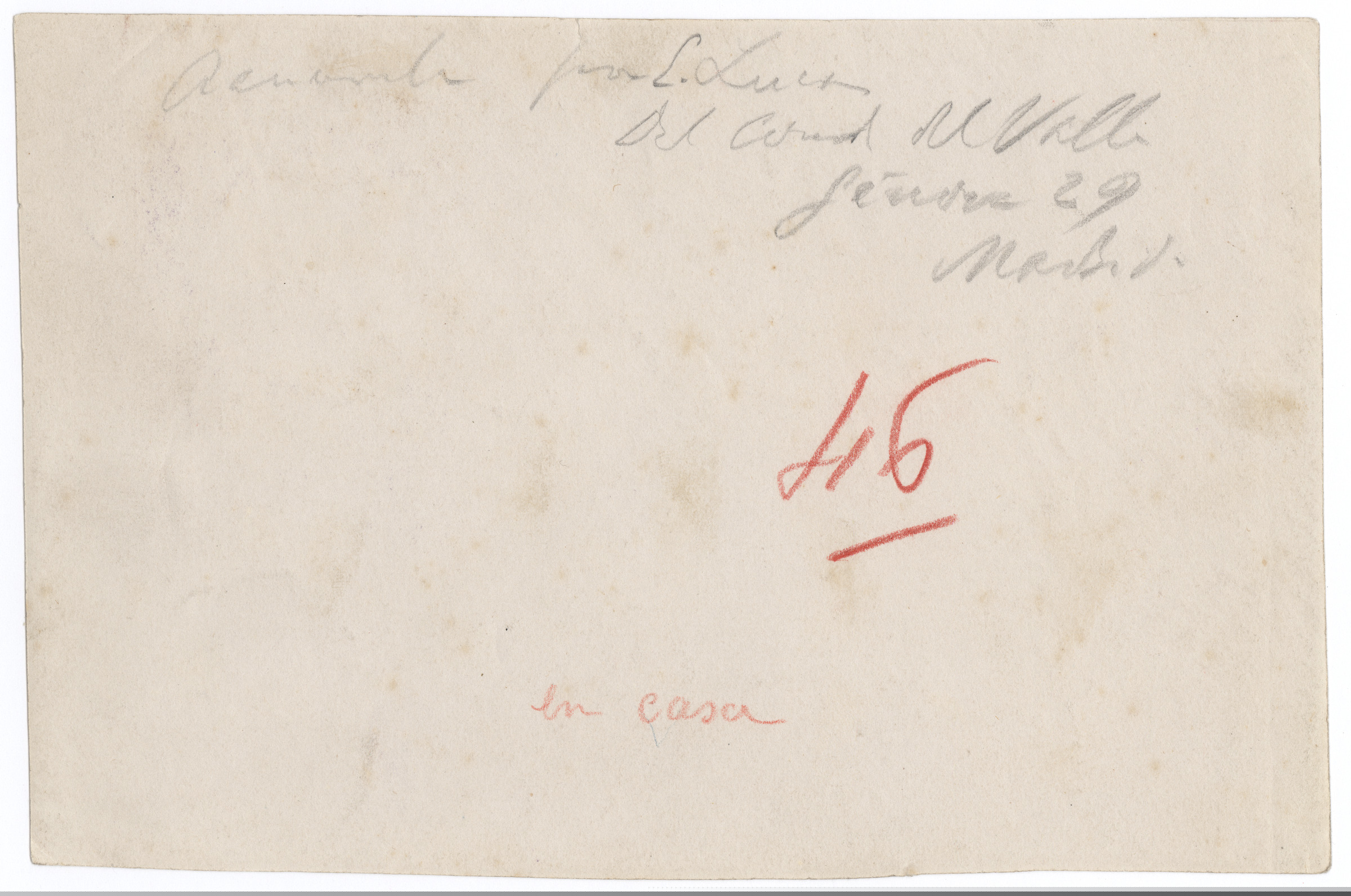 | Acuarela de Luca del Conde de Valle en la casa de Génova en Madrid | Acuarela por E. Luca. Del Conde del valle, Génova 29. Madrid 46 en casa. [m.s.v.] |