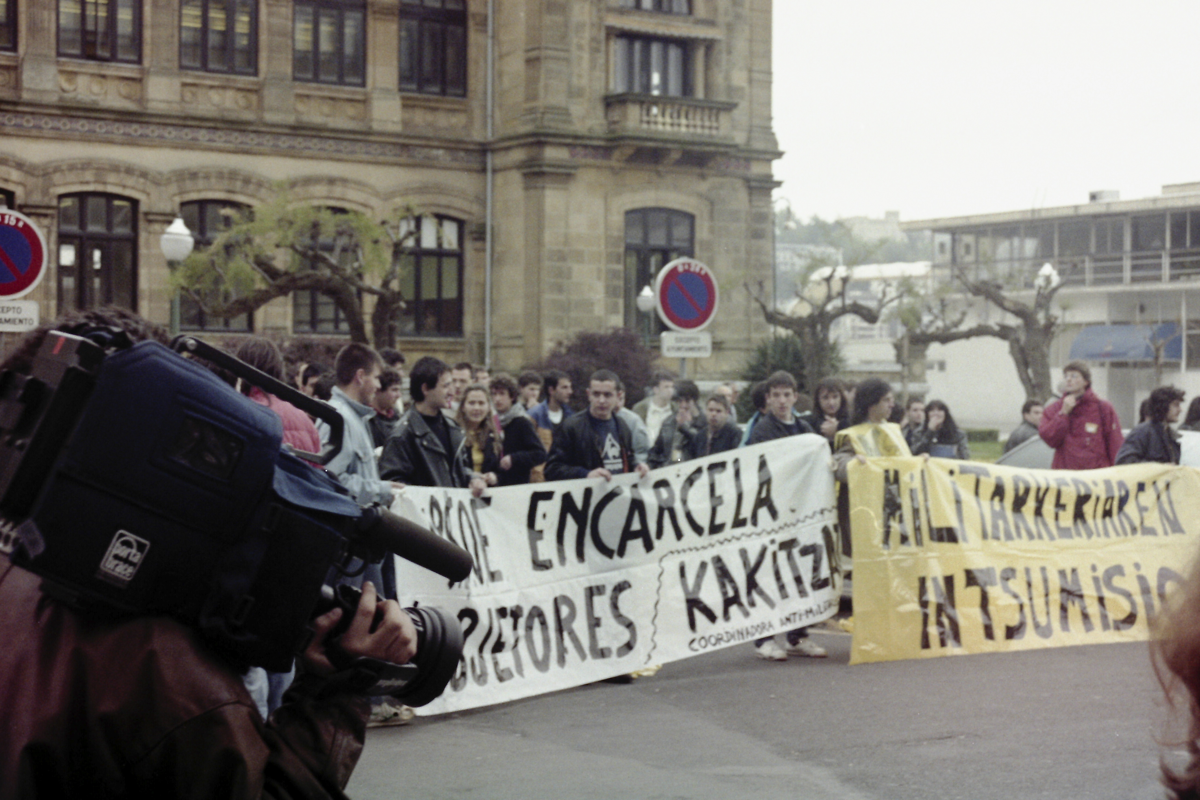 | Manifestación ante la sede del Gobierno Militar en San Sebastián. En las pancartas rezan "Militarkeriaren aurka. Intsumisioa"; "PSOE encarcela a los objetores. KAKITZAT" |