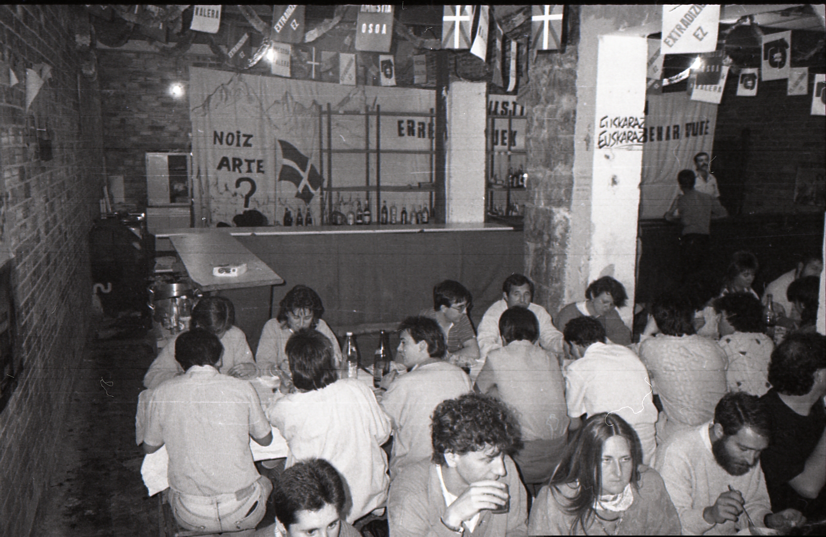 Comida popular con numerosos carteles reivindicativos. Destaca uno que dice "Amnistia osoa orain. Errefuxiatuek Euskadin bizi behar dute" |
