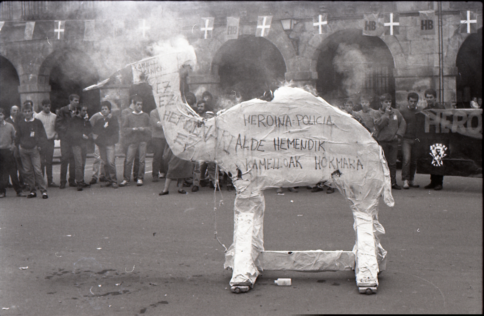 | Manifestación y representación en contra de la heroína en un camello de cartón con ruedas se han escrito diversas consignas: "Ez, ez, ez. Heroinari ez. Heroina policia, alde hemendik. Kamelloak hormara." |