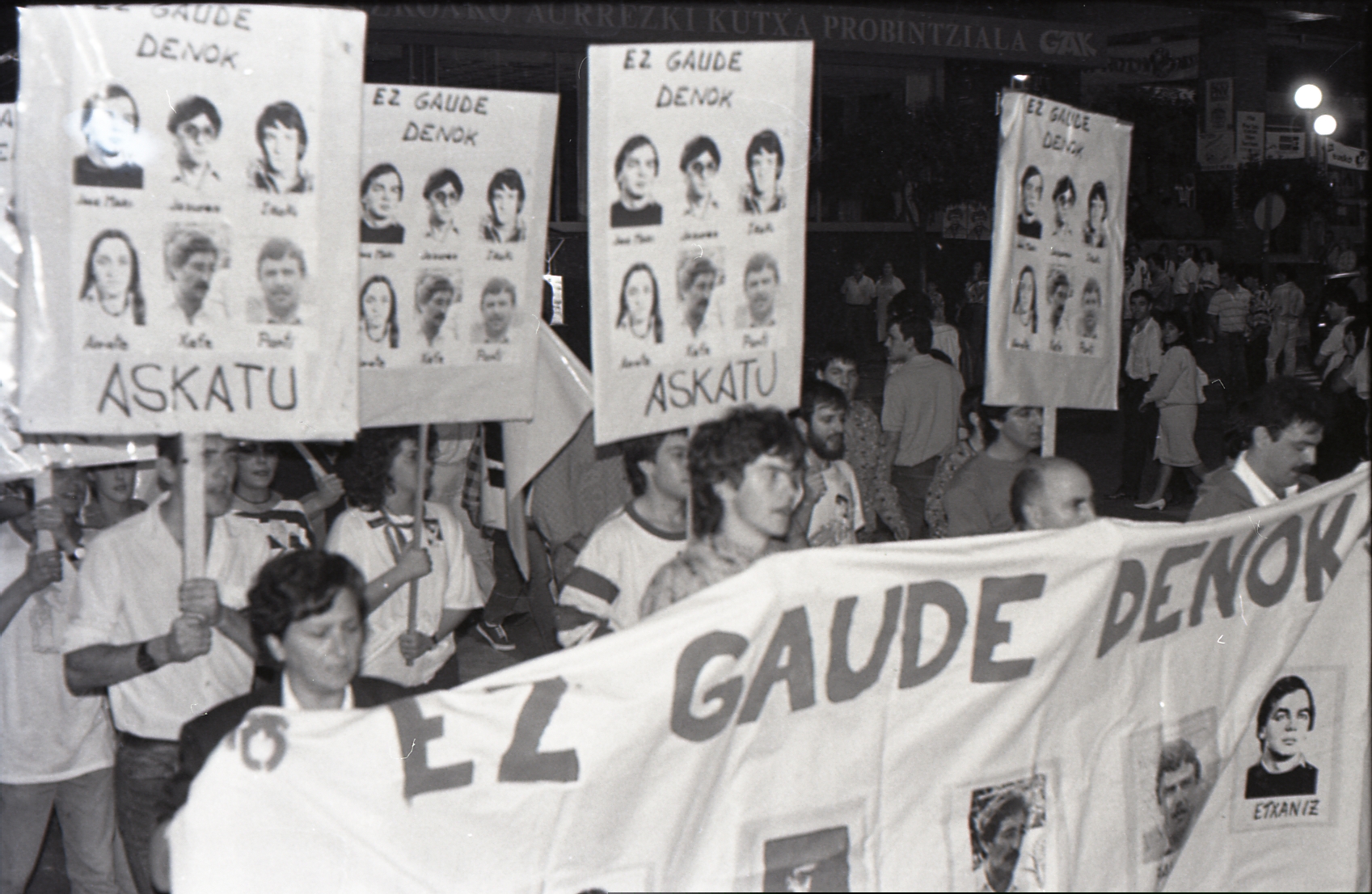 | Manifestación en las fiestas de Pascuas de Pentecostés con el lema "Ez gaude denok" y con las imágenes de los presos bergareses |