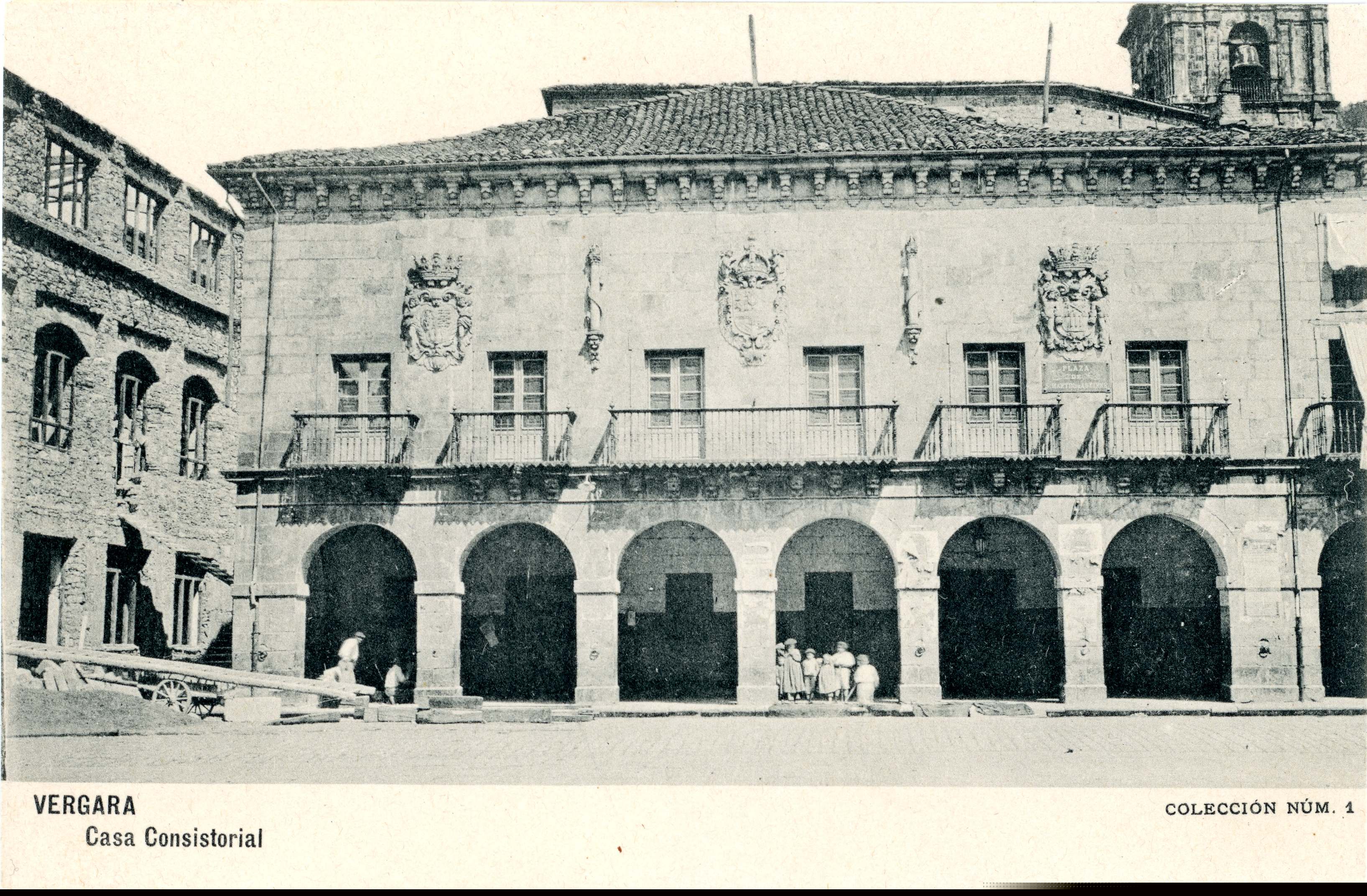 | Fachada del Ayuntamiento; a la izquierda se está construyendo el edificio de Correos; grupo de niños de un arco central | VERGARA. Casa Consistorial - Colección núm. 1 [imp. r.] |