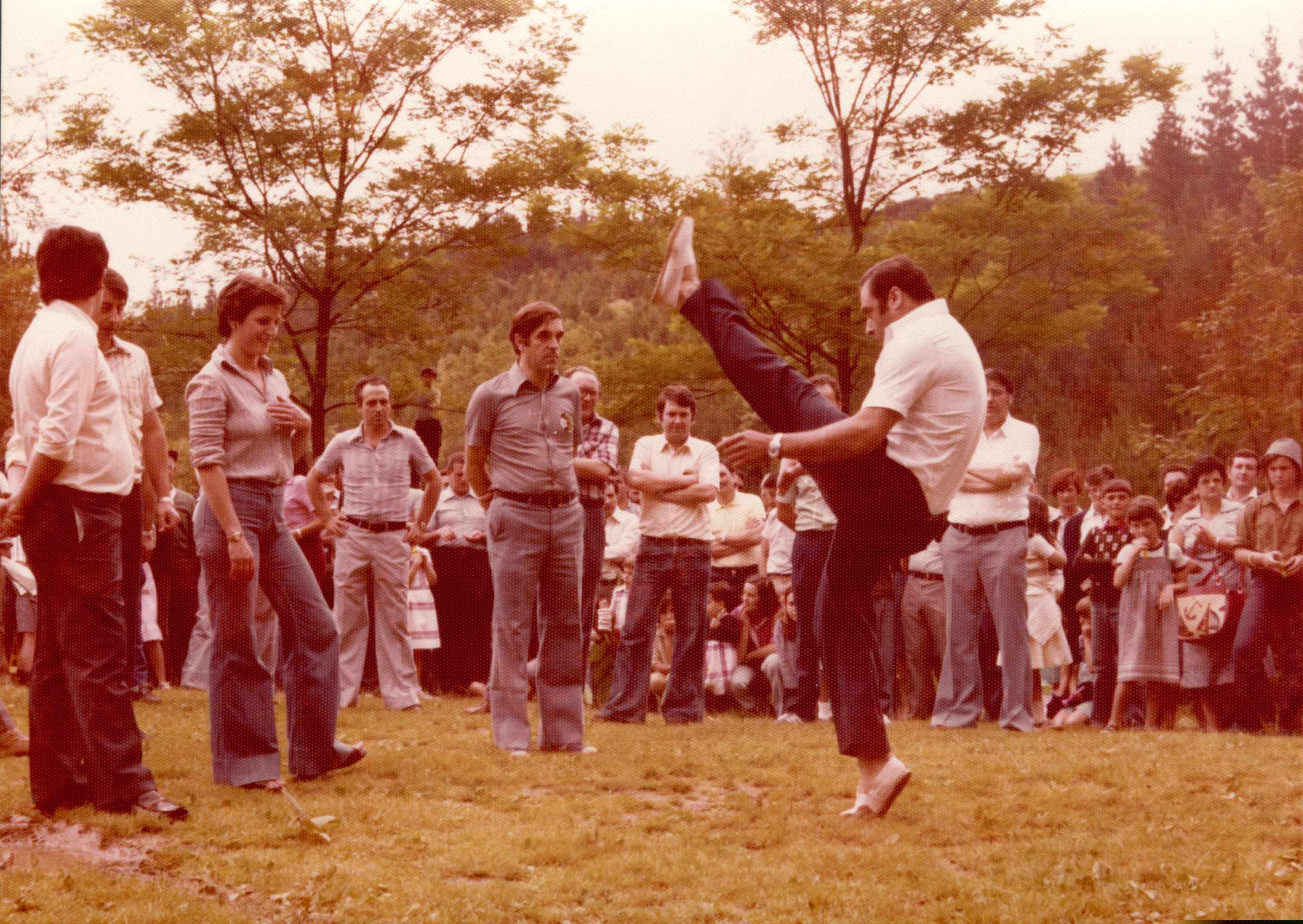 | Bailando el aurresku en la campa de San Marcial | "Foto Uribe. Bodas - Reportajes - Fotos en color - Blanco y negro. Teléf. 76 26 77 - Vergara - 3 JUL 1977" [imp. v.] |