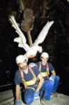 Trabajadores de la restauración del retablo de la iglesia de la Marina junto a la paloma de Santa Espíritu Santo