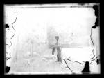 Grupo de hombres, dos niños delante y una silla; tres vasos en bandeja sobre la silla. El primer hombre de la izquierda del grupo, de camisa blanca, bebiendo por la botella; el segundo de la izquierda, con vaso en la mano; dos hombres de la derecha con...