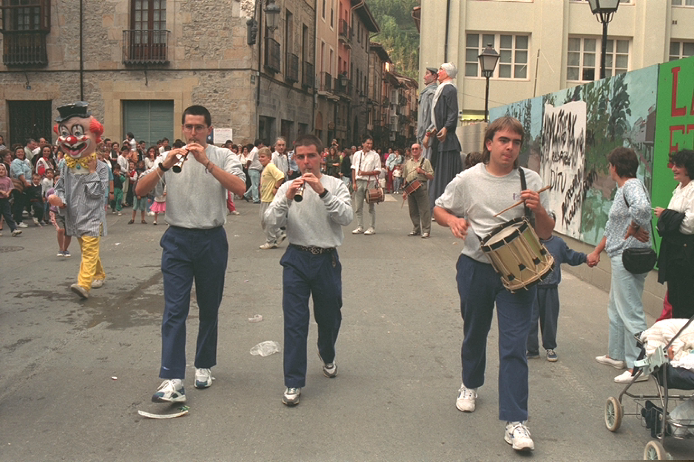 | Dultzainero taldea kalejiran erraldoi, kiliki eta buruhandiekin |