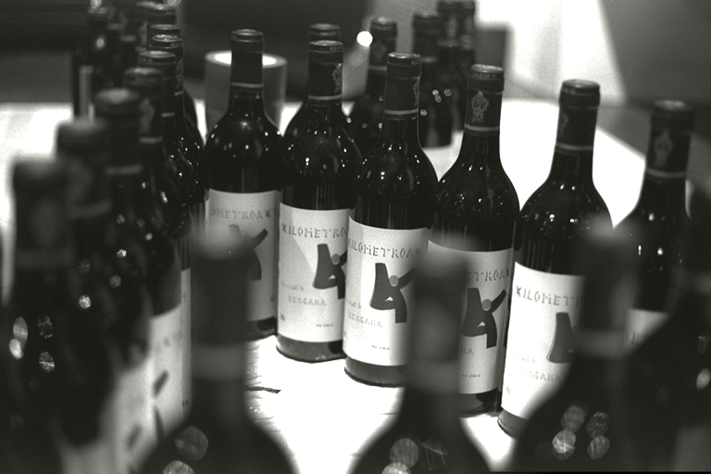 Kilometroen logotipoa ardo botilekin eginda |