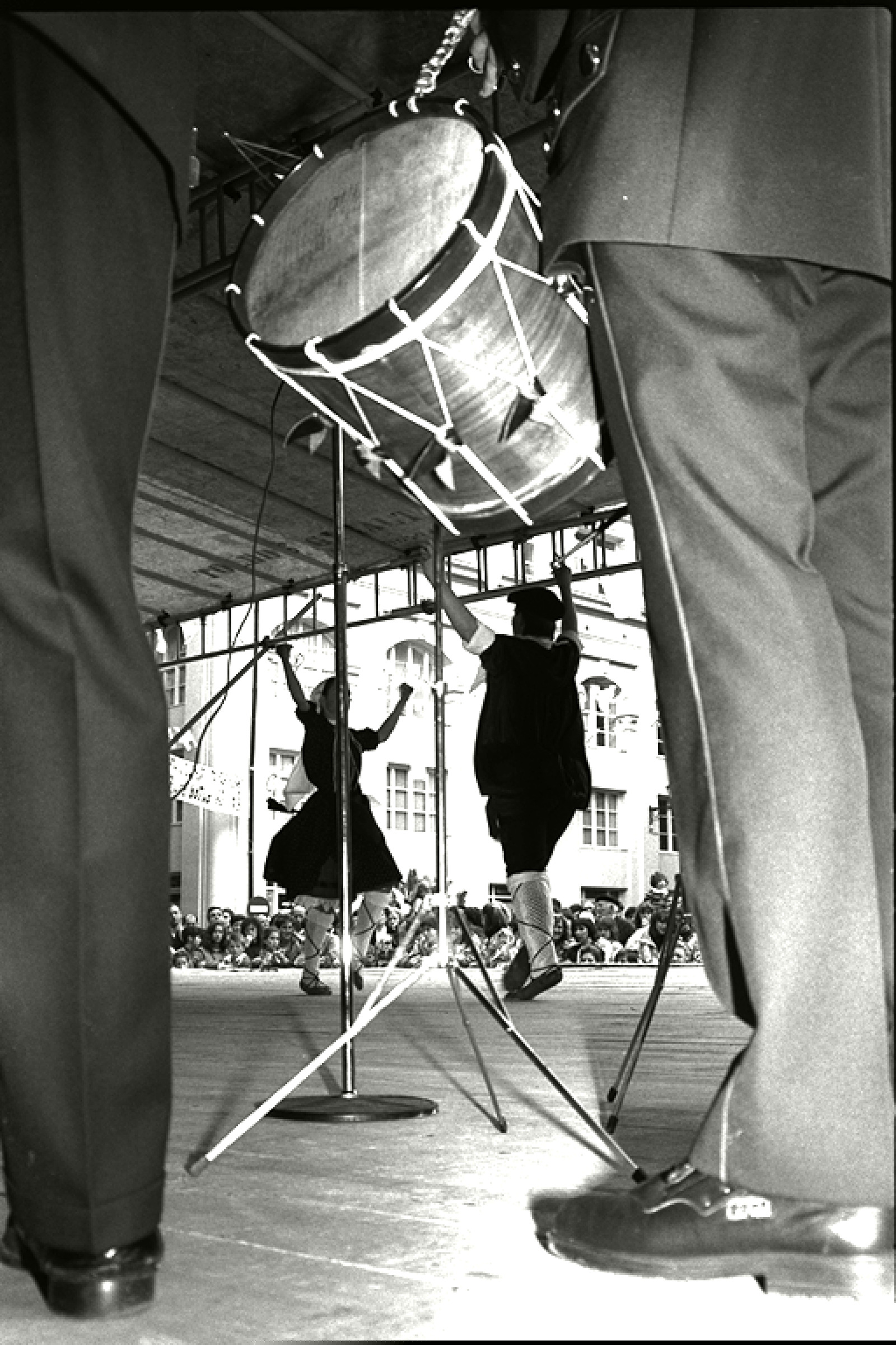 | Dantza txapelketa lehenengo planoan danborila, bigarrenean dantzariak |