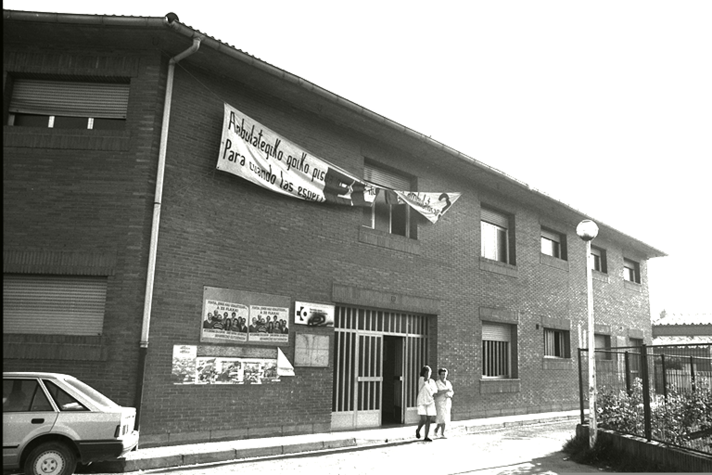Anbulatorioko fatxada; bigarren pisuan pankarta |