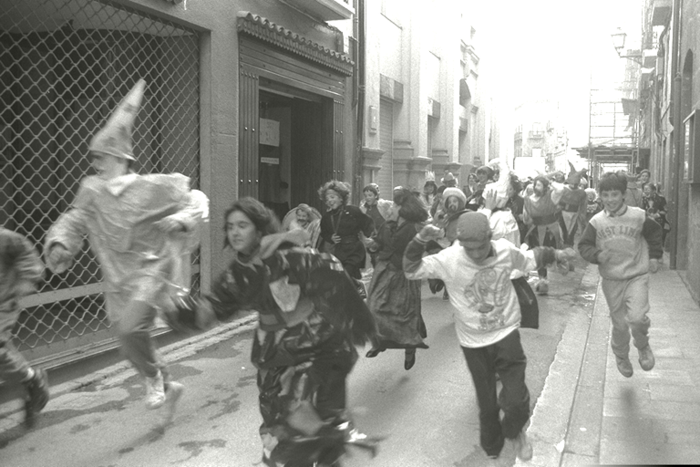| Jendea mozorrotuta Barrenkaletik korrika |