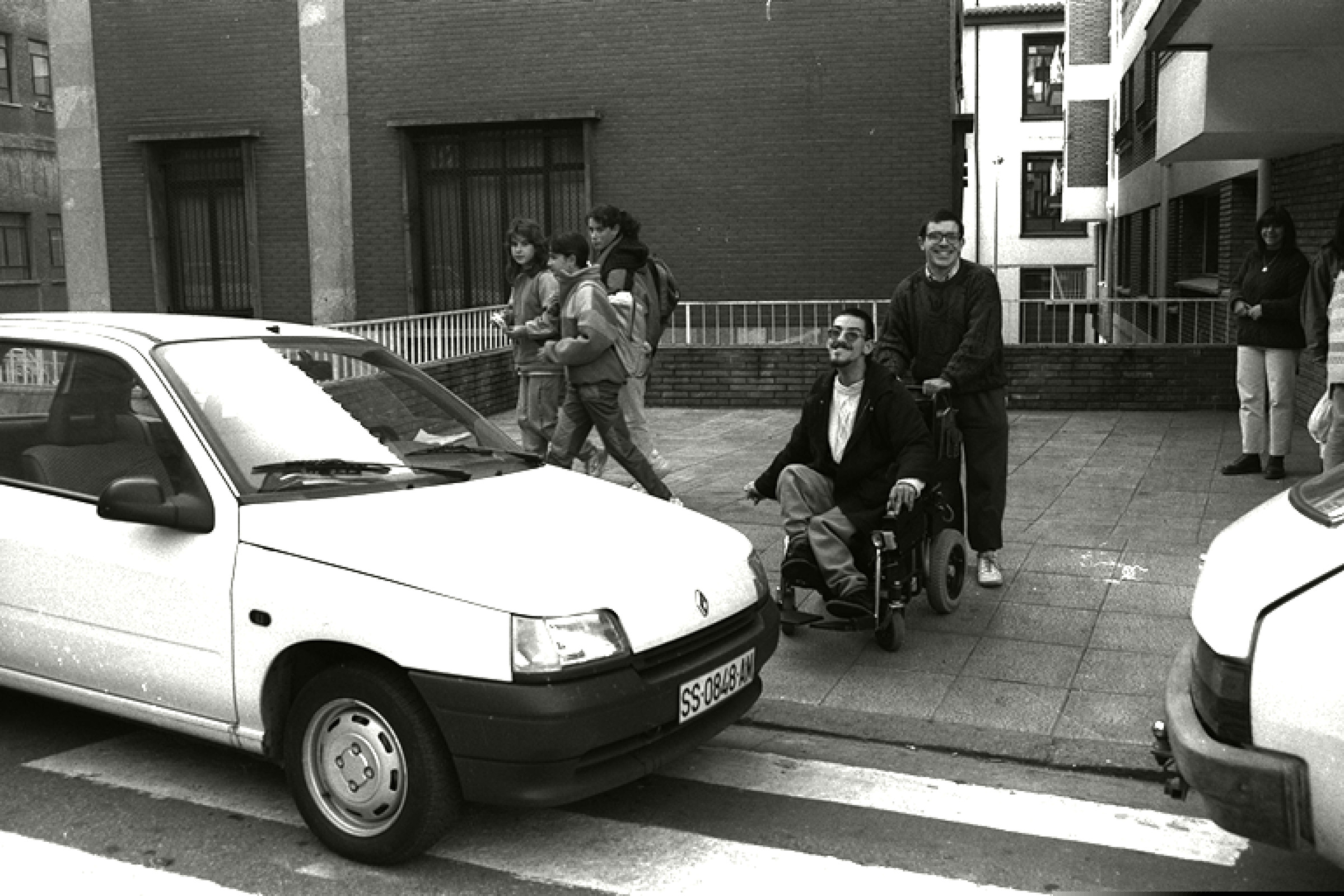 Gizona gurpil-aulkian bidea gurutzatzen beste gizon baten laguntzarekin |
