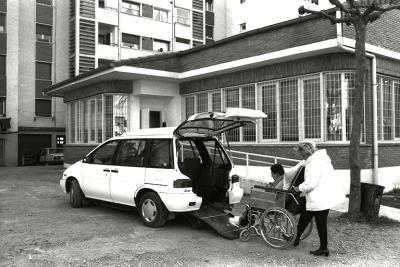 Gizona gurpil-aulkian egokitutako taxira igotzen |