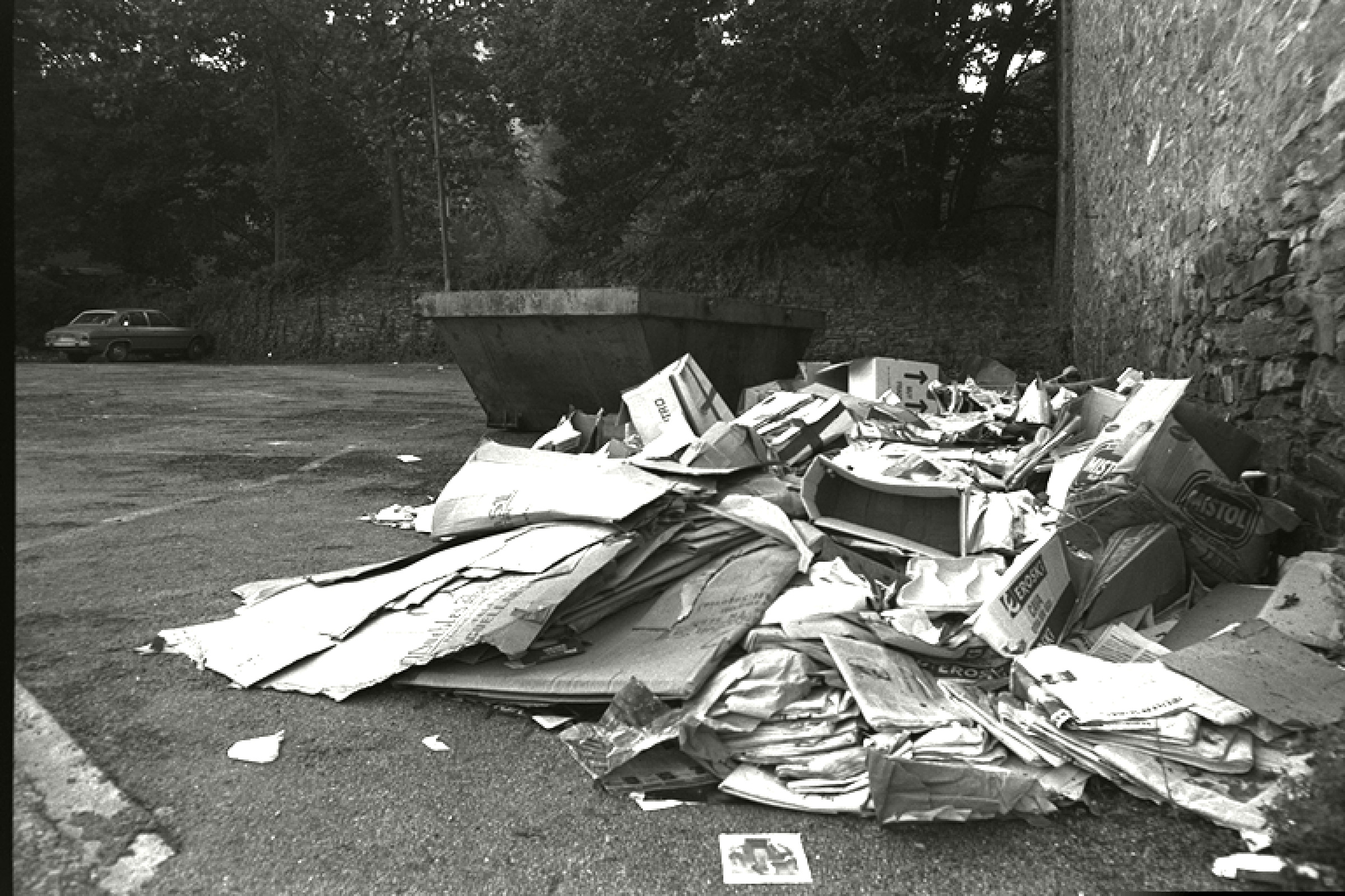 | Erabilitako papera eta kartoi multzoa; bigarren planoan kontenedorea |