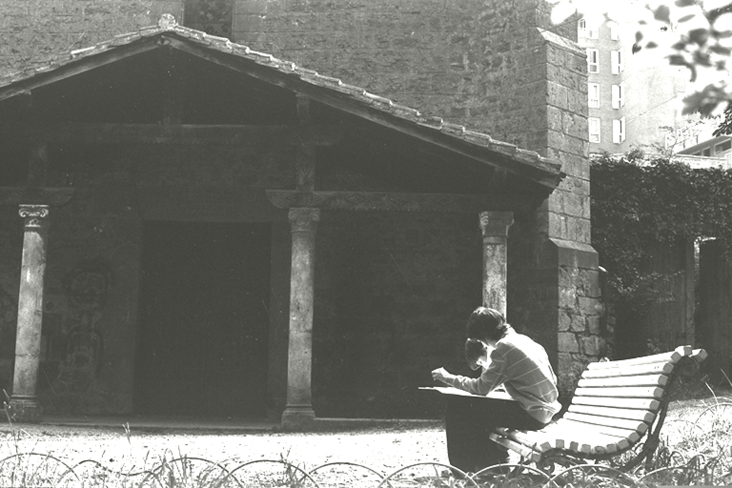 | Bi mutil marrazten Errotalde jauregiaren lorategian |