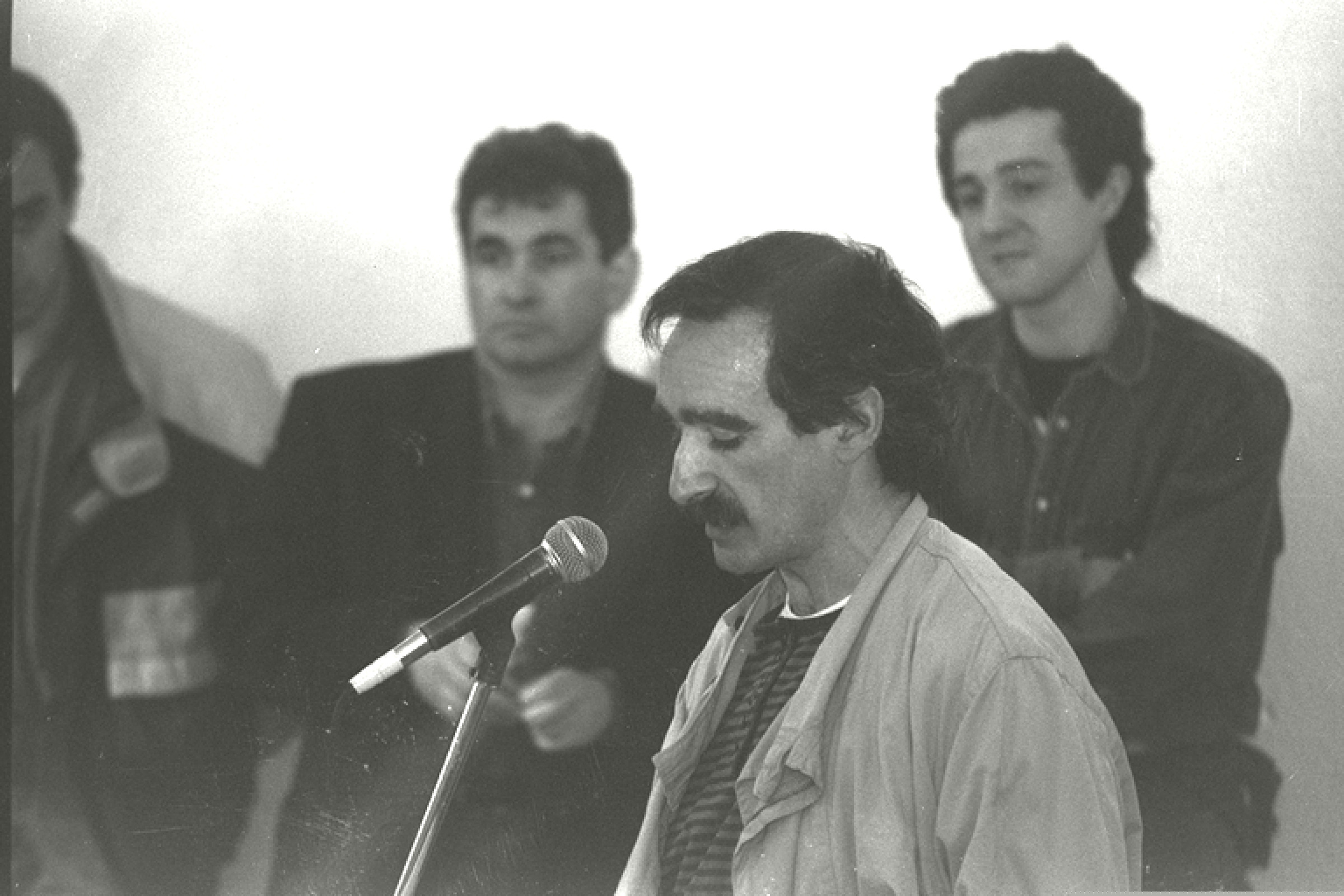 | Gizona mikrofonoz hitzegiten, atzekaldean beste bi gizon entzuten |