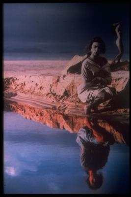 Emakumea makurtuta eta bere irudia uretan isladatua |