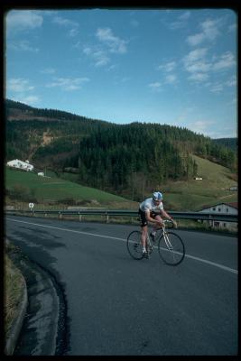 | Txirrindularia aldapan gora; ezkerraldean Harane erdikoa baserria |