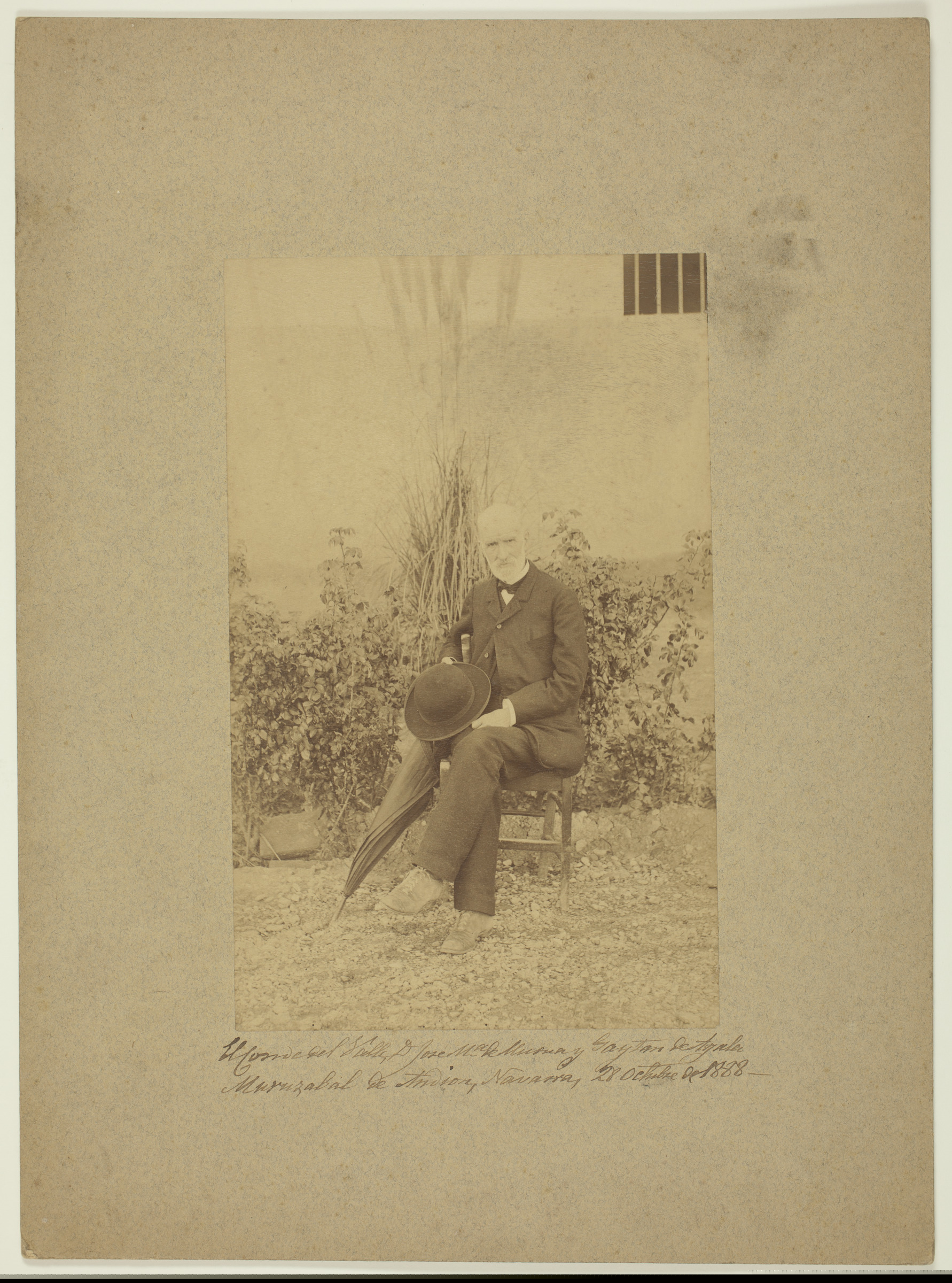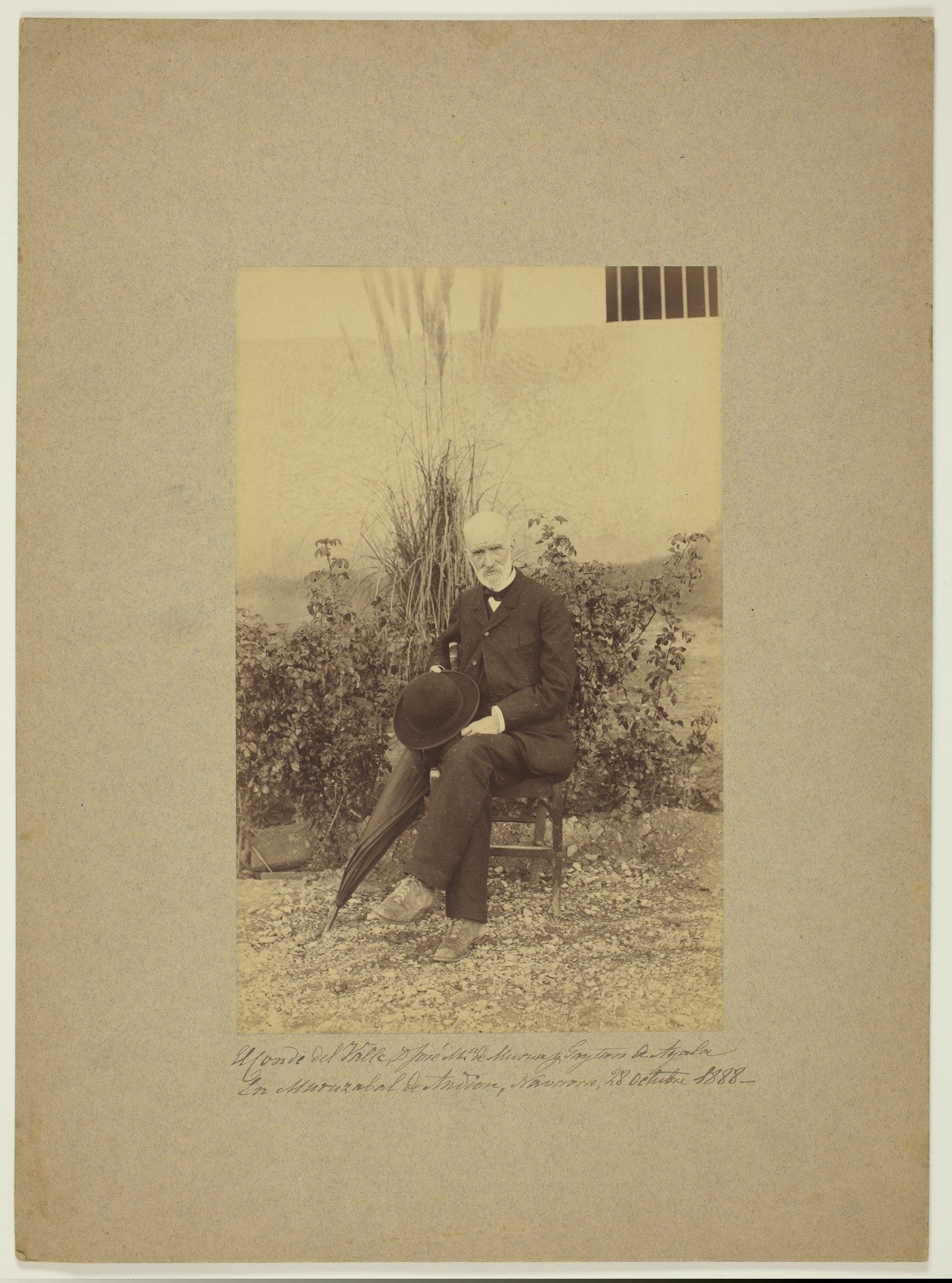 | Gizon baten erretratua lorategian: plano osoa, eserita, eskuan sombreroa eta aulkian euritakoa | El Conde del Valle, D. José Mª de Múrua y Gaytán de Ayala, en Muruzabal de Andión, Navarra, 28 Octubre 1888 [ms. r.] |