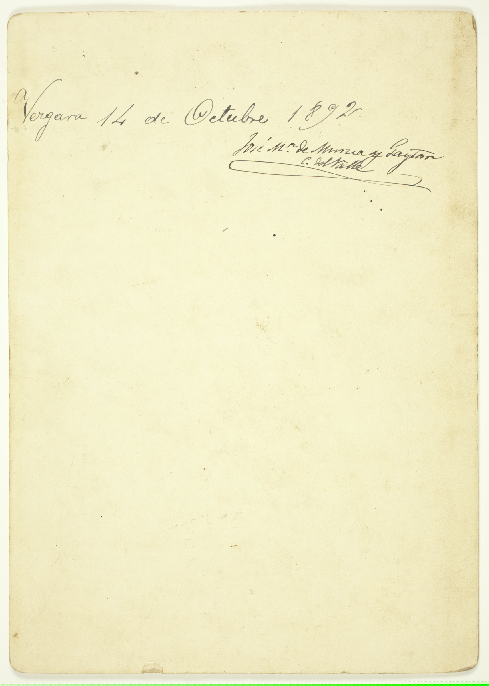 | Gizon baten erretratua: plano erdia, eserita | Vergara 14 de Octubre 1892 [sinadura:] José Mª de Murua y Gaytán, C. del Valle[ms. v.]; Marqués de Villafuerte [imp. r.] |