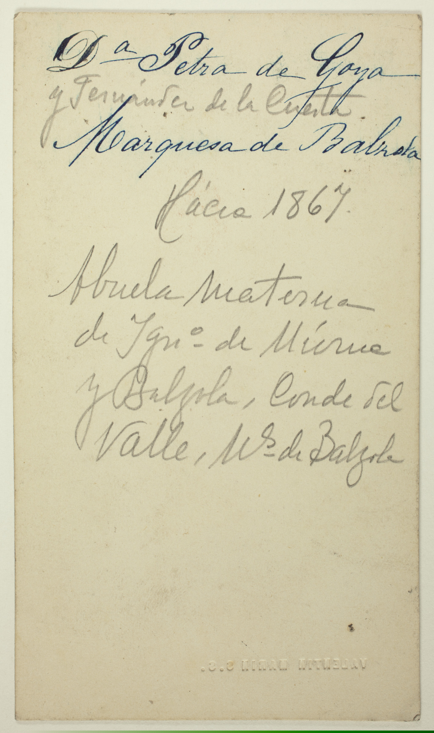 | Emakume erretratua | Dª Petra de Goya y Fernández de la Cuesta, Marquesa de Balzola, Hacia 1867. Abuela materna de Ignº de Múrua y Balzola, Conde del Valle, Ms. de Balzola [ms. v.]; Valentin Marin S.S. [imp. r.] |