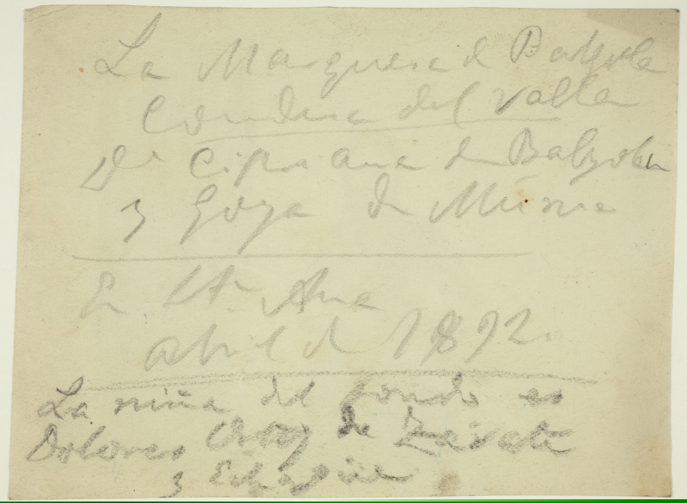 | Emakume erretratua; bigarren planoan, pantaila txuriaren atzekaldean eta lehioaren ostean, umea eta emakumea ikusten dira | La Marquesa de Balzola, Condesa del Valle, Dª Cipriana de Balzola y Goya de Múrua. En Sta. Ana, abril de 1892. La niña del fondo es Dolores Ortiz de Zárate y Echagüe [ms. v.] |
