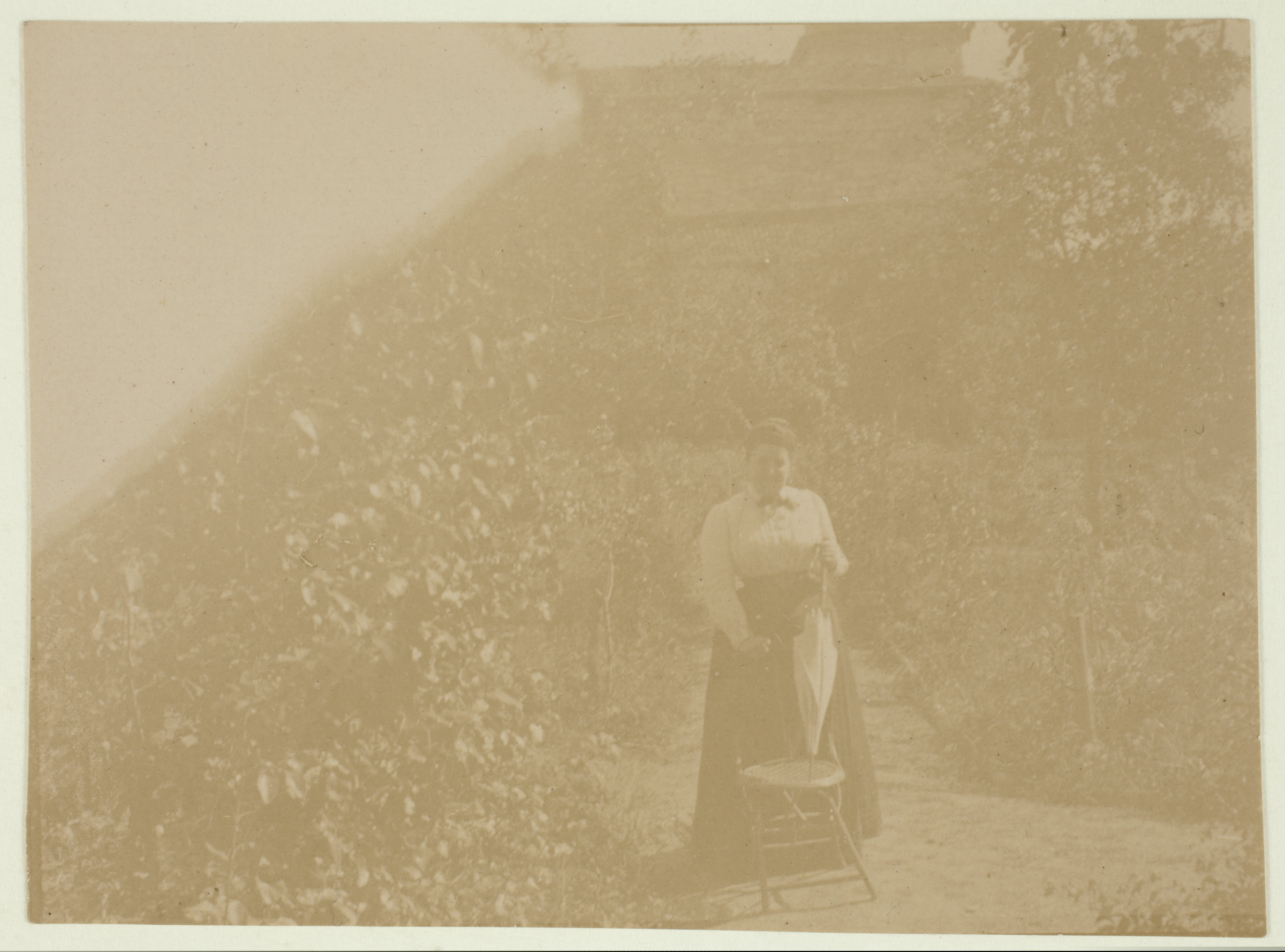 | Emakumea lorategian, eskuan eguzkitakoa duela eta aurrean aulkia |