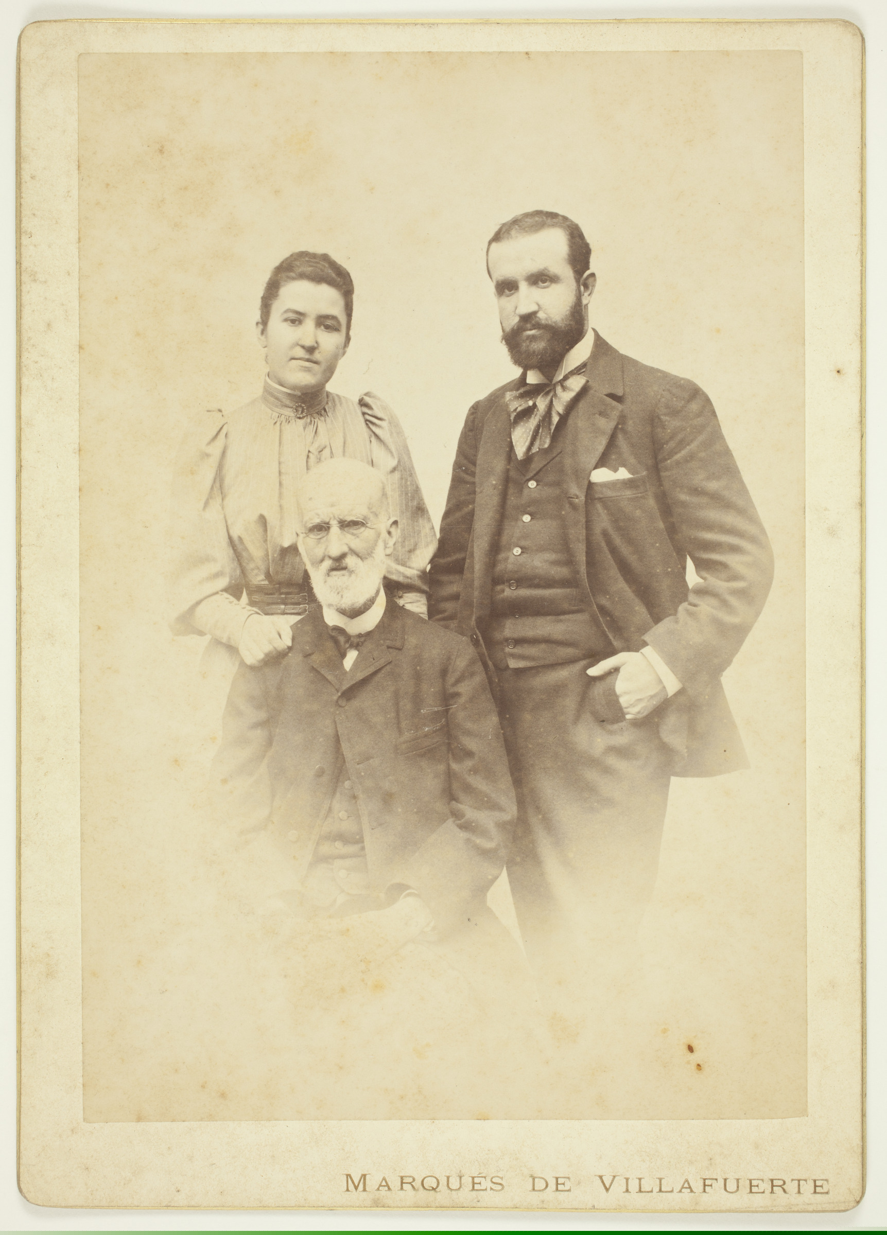 Talde erretratua: gizon edadetua eserita, bere atzean emakumea eta gizon gazteak zutik | Vergara 14 de Octubre de 1892, [sinadura:] José Mª de Múrua y Gaytán, Conde del Valle, [sinadura:] Ana María de Múrua y de Balzola, [sinadura:] Ignacio de Múrua y de Balzola [ms. v.]; Marqués de Villafuerte [imp. r.] |