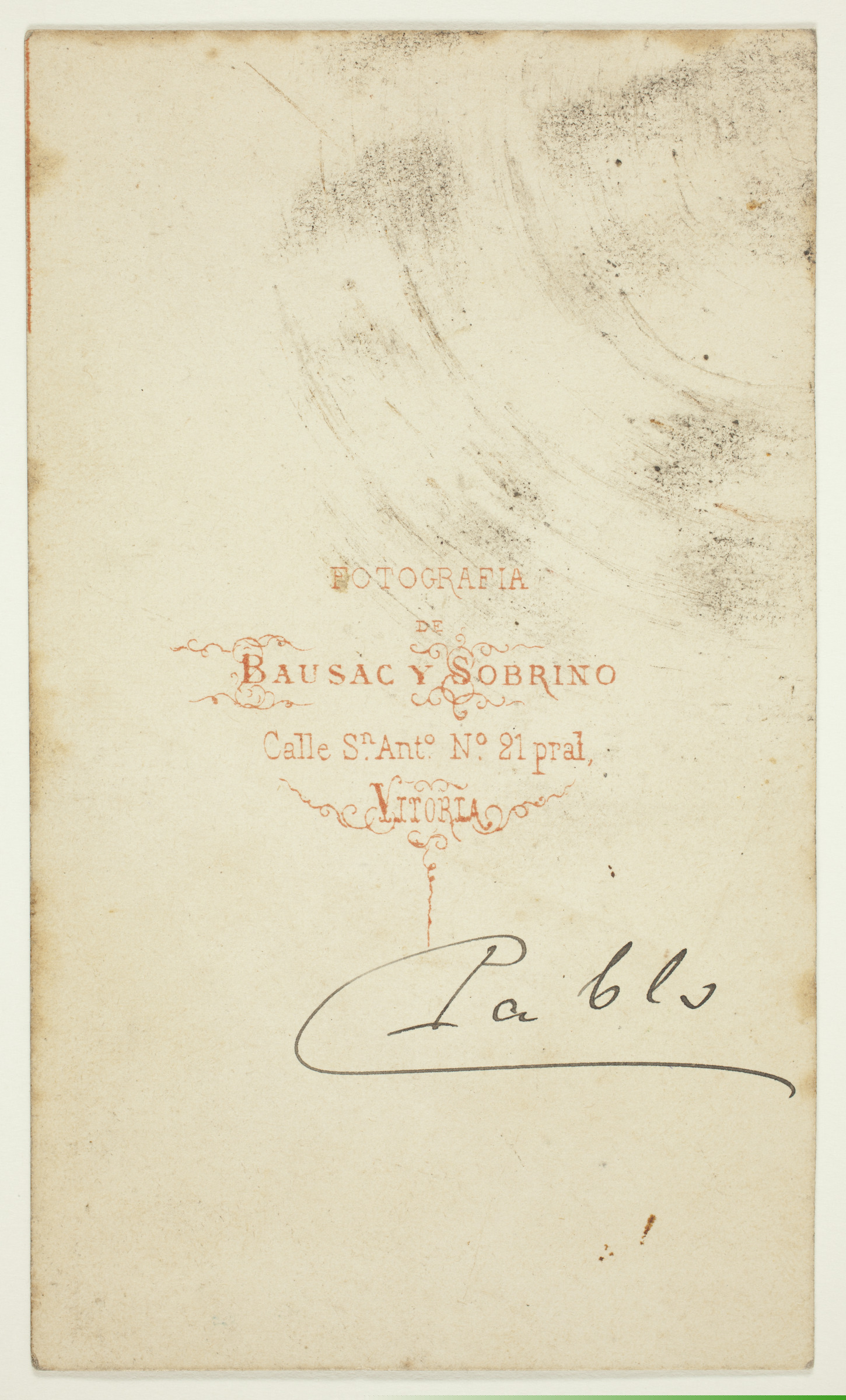 | Gizon erretratua | [sinadura:] Pablo [ms. v.]; Bausac y Sobº [imp. r.]; Fotografía Bausac y sobrino, Calle Sn. Antº. Nª 21 pral. Vitoria [imp. v.] |
