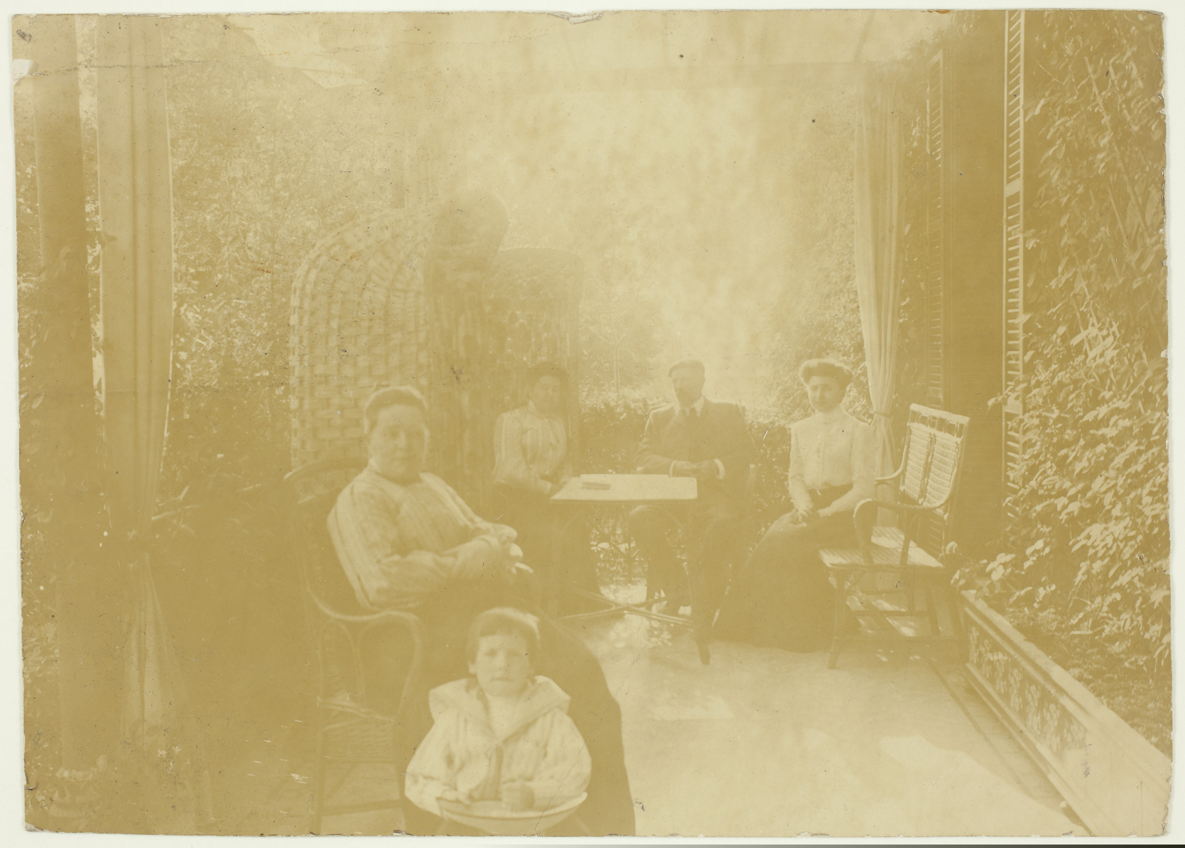 | Talde erretratua lorategian: lehenengo planoan umea |