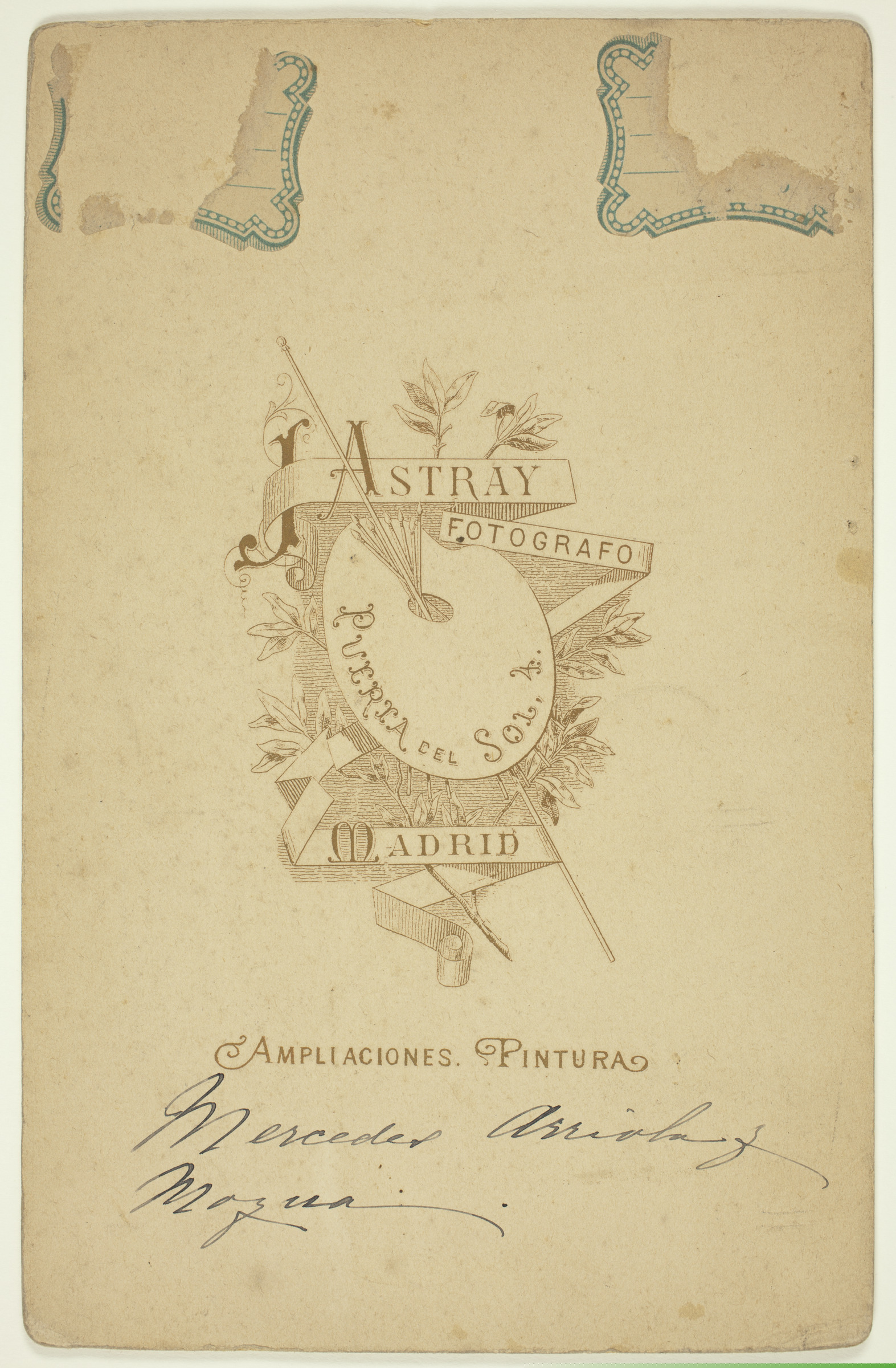 | Emakume erretratua kitarra jotzen | A mi querdia Anita su afma. [sinadura:] Mercedes, Enero 9/86 [ms. r.]; Mercedes Arriola y Moyua [ms. v.]; J. Astray, Puerta del Sol, 4 [imp. r.]; J. Astray, Fotógrafo, Puerta del Sol, 4, Madrid [imp. v.] |