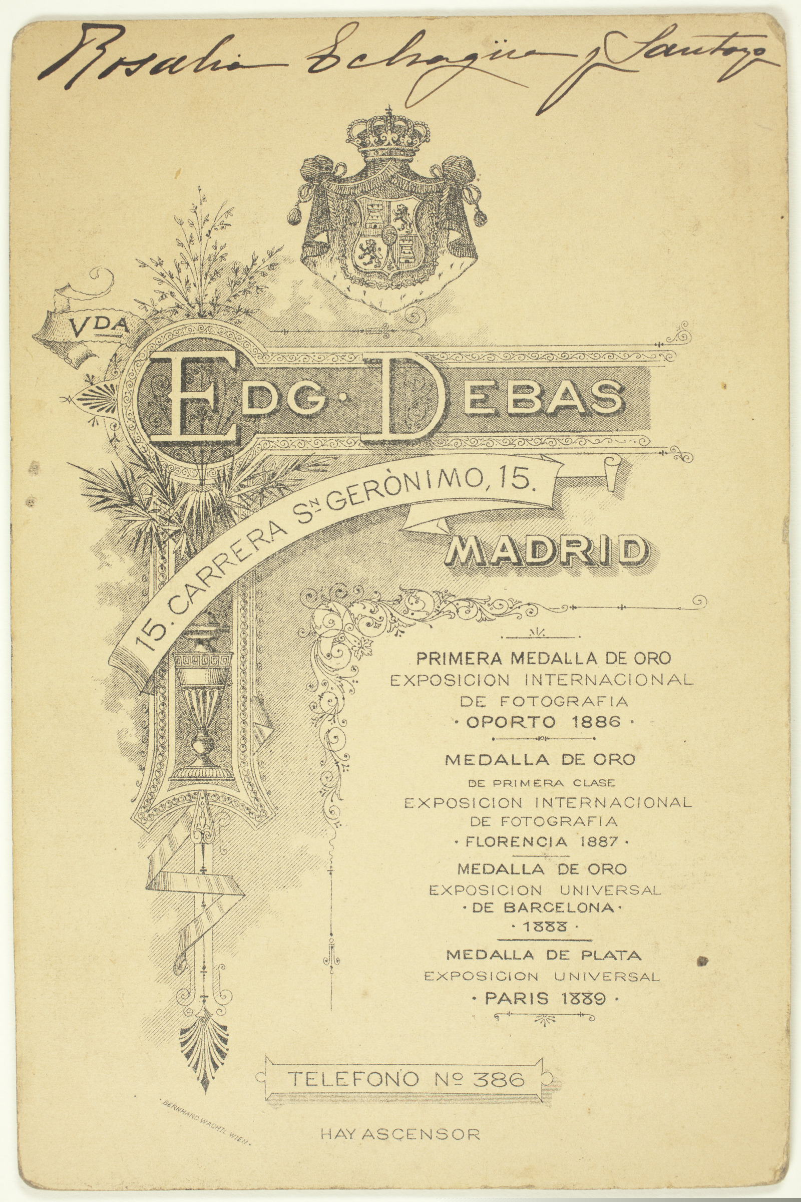 | Emakume erretratua | [sinadura:] Rosalía, 1895 [ms. r.]; Rosalía Echagüe y Santoyo [ms. v.]; Vda. Edg. Debas, Cra. Sn Gerónimo ,15, Madrid [imp. r.]; Vda. Edg. Debas, 15, Carrera Sn. Gerónimo, 15, Madrid [imp. v.] |