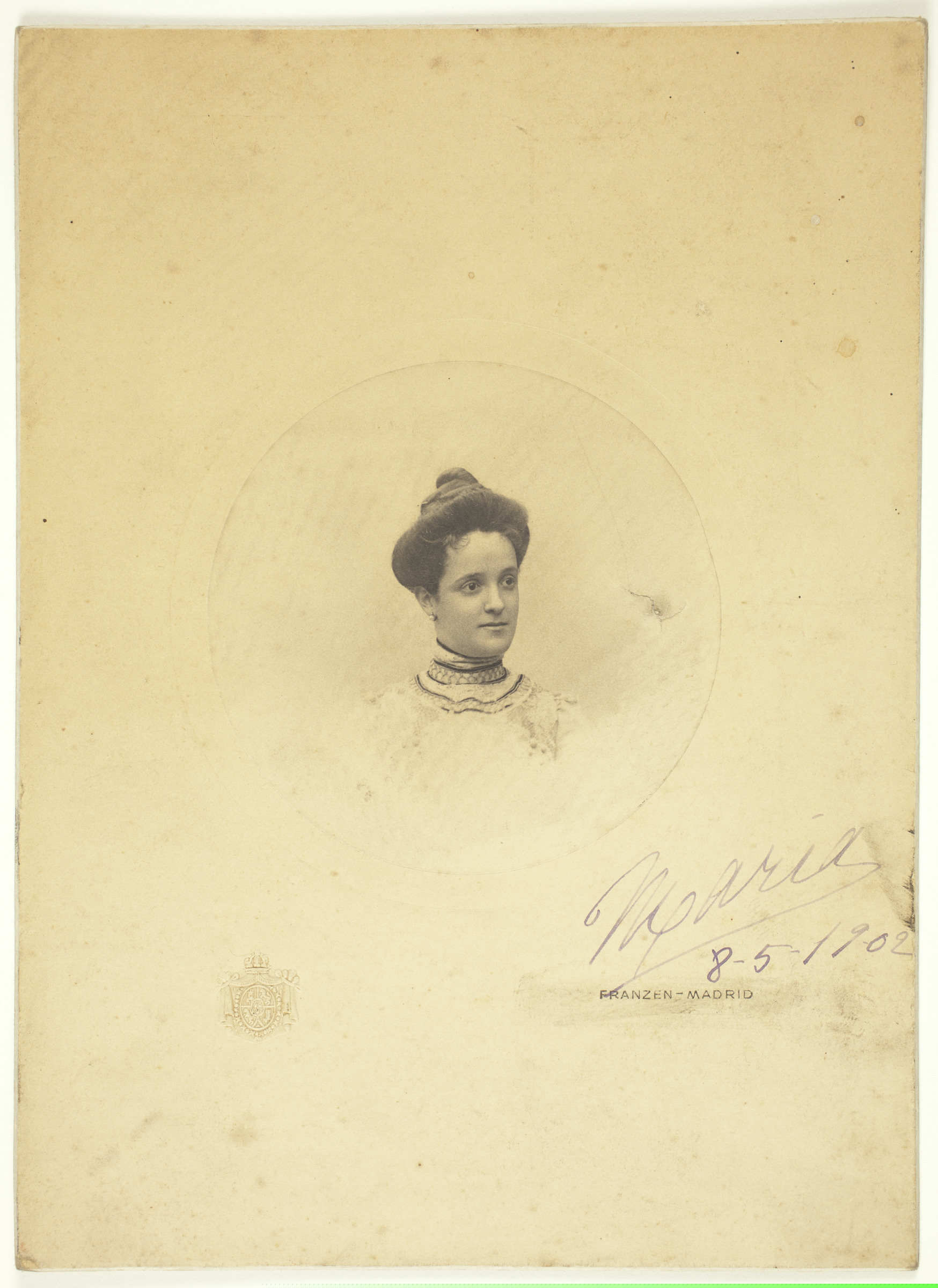 Emakume erretratua | [sinadura:] María, 8 - 5- 1902 [ms. r.];Condesa de Egaña [ms. v.]; Franzen - Madrid [imp. r.] |