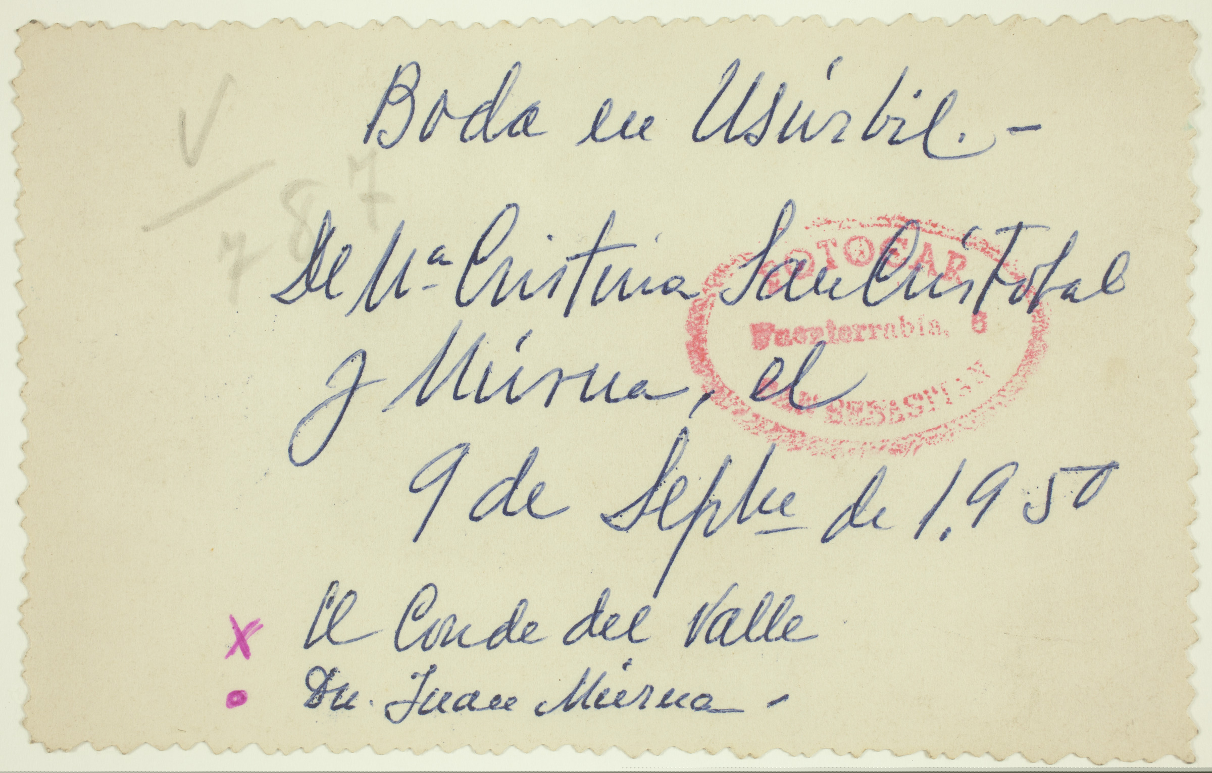 | Ezkontzaren elizkizuna | Boda en Usurbil, de Mª Cristina San Cristóbal y Múrua, el 9 de Sepbre de 1950, x El Conde del Valle, • Dn Juan Múrua, V-787 [ms. v.]; Fotocar, Fuenterrabía, 6, San Sebastián [imp. v.] |