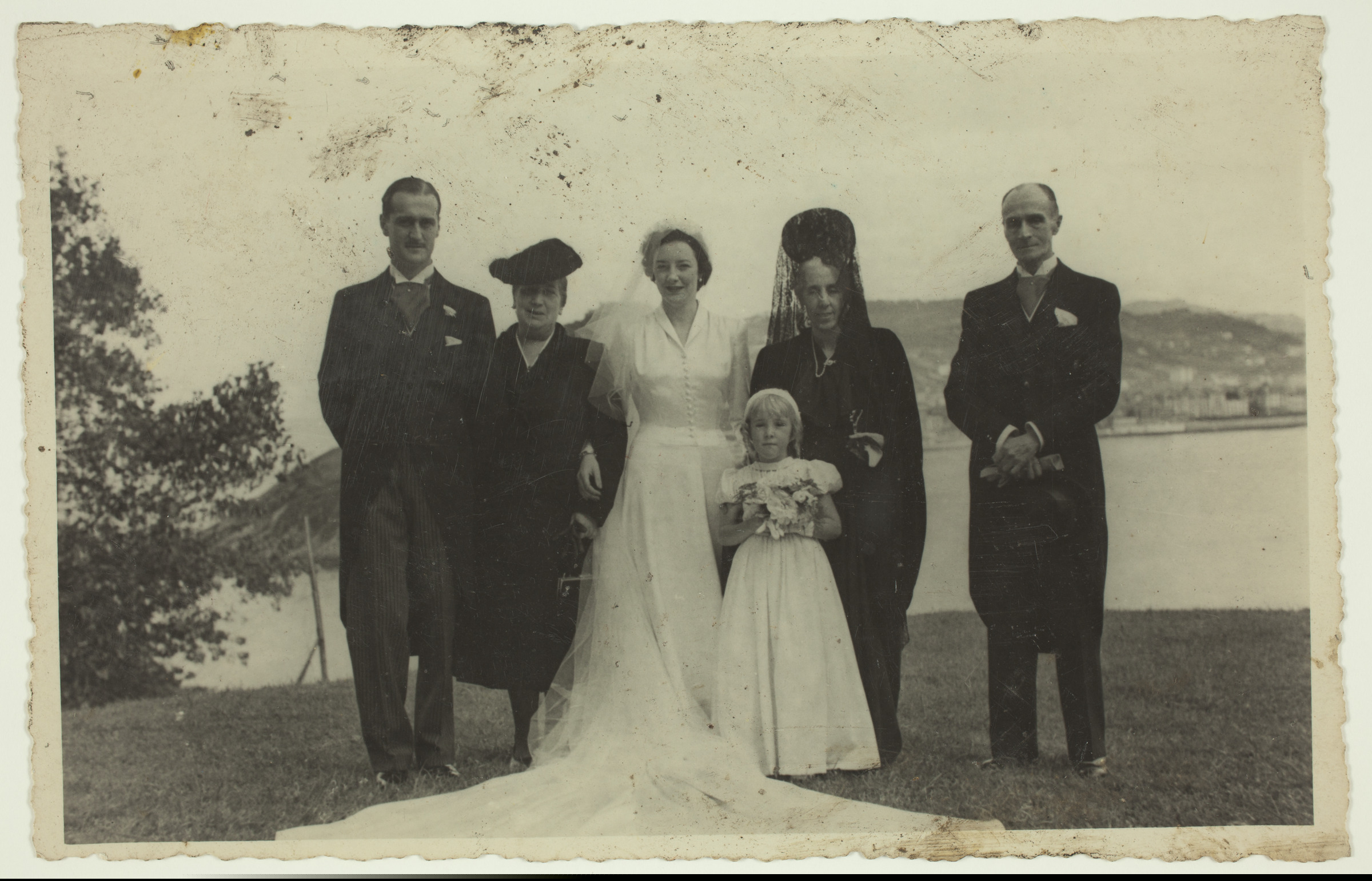 Talde erretratua emaztegaiarekin; atzealdean Kontxako badia | La Baronesa Vda de Satrústegui, con su hija casada con Gil Casares, en San Sebastián, en 1942, R/276 [ms. v.] Fotocar, Fuenterrabía, 6, San Sebastián [imp. v.] |