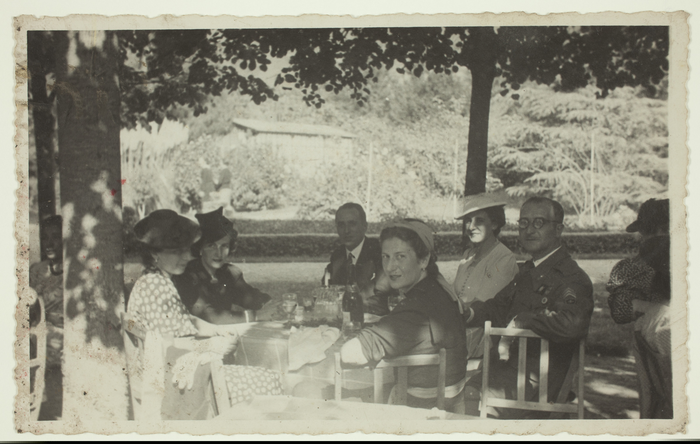 | Taldea mahaiaren inguruan lorategian; gizonezko batek uniforme militarra darama; atzealdean baserria ikusten da | 1/1 [ms. v.]; Photo-Carte, Fuenterrabía, 6, Reportaje de Actualidad, San Sebastián [imp. v.] |