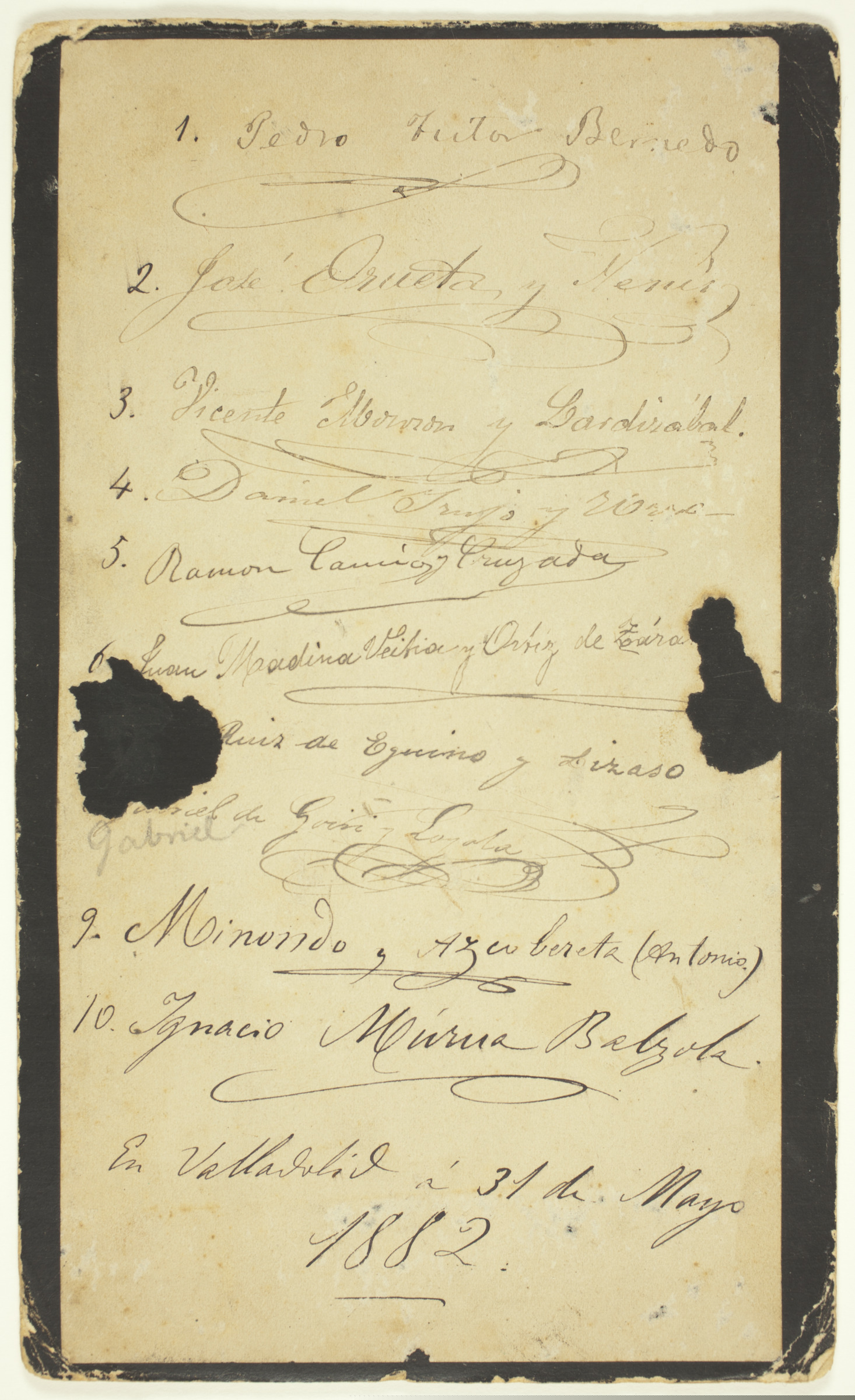 Talde erretratua | 1 [sinadura:] Pedro Tutor Bernedo, 2. [sinadura:] José Orueta y Nenín, 3. [sinadura:] Vicente Monzón y Lardizabal, 4. [sinadura:] Daniel Irujo y [?], 5. [sinadura:] Ramón Camio y Cruzada, 6. [sinadura:] Juan MadinaVeitia y Ortiz de Zárate, [7.] [sinadura:]Ruiz de Eguino y Lizaso, [8. Gabriel] [sinadura:]de Goiri y Loyola, 9. [sinadura:] Minondo y Azcobereta (Antonio), 10. [sinadura:]Ignacio Múrua Balzola, En Valladolid á 31 de Mayo 1882 [ms. v.]; Eguren, Valladolid [imp. r.] |