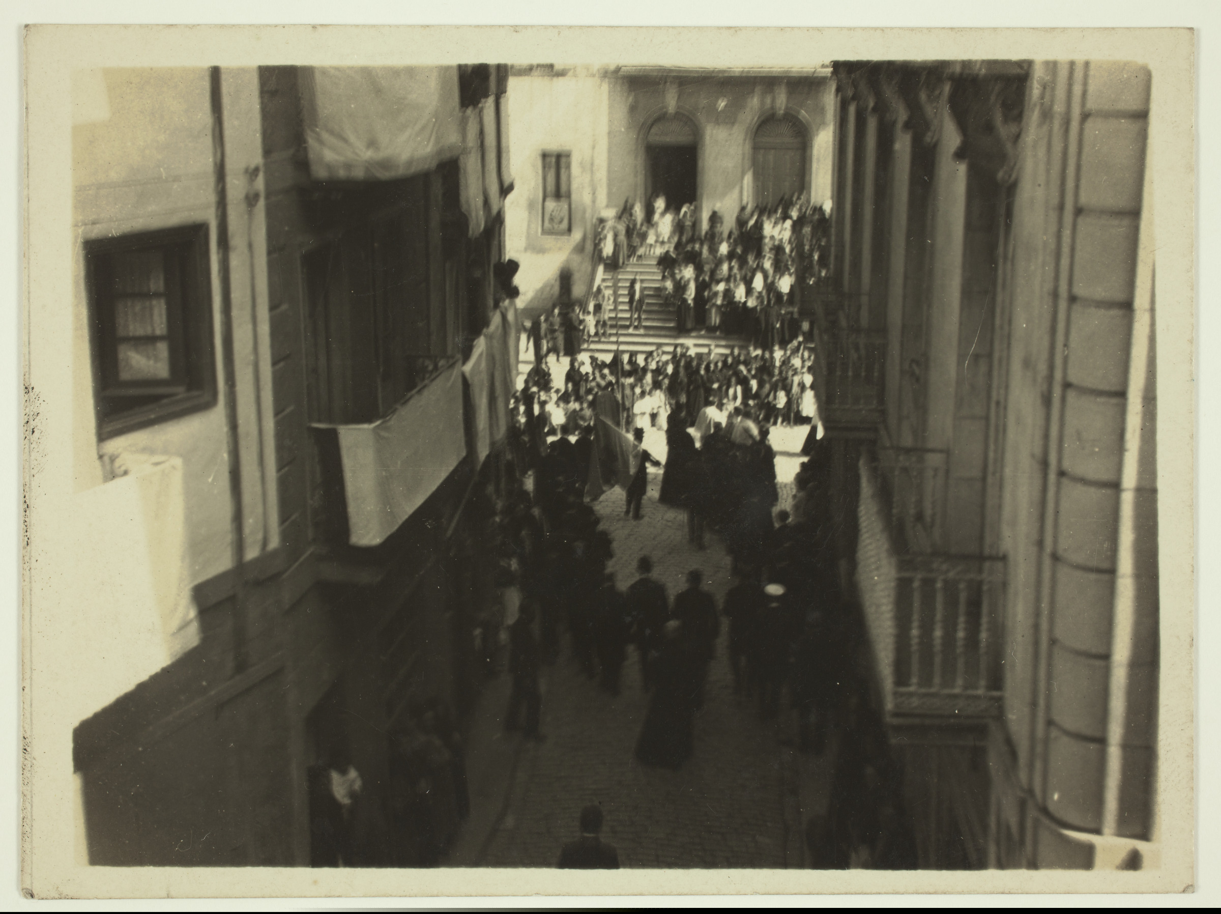 Prozesioa kaleetatik zehar; atzealdean Udaletxearen sarrerako eskailerak ikusten dira | Lequeitio, 11 septiembre 1922, Paso de la reliquia de S. Ignacio de Loyola, Francisco Javier [ms. v.] |