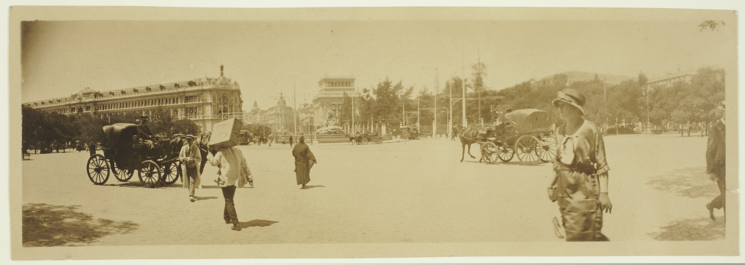 | Madrideko Cibeles plazaren bista: zalgurdiak, jendea | Madrid 4 Junio 1920, a las 12 del medio día, Plaza de la Cibeles, El Banco de España, El del Río de la Plata y el Ministerio de la Guerra [ms. v.] |
