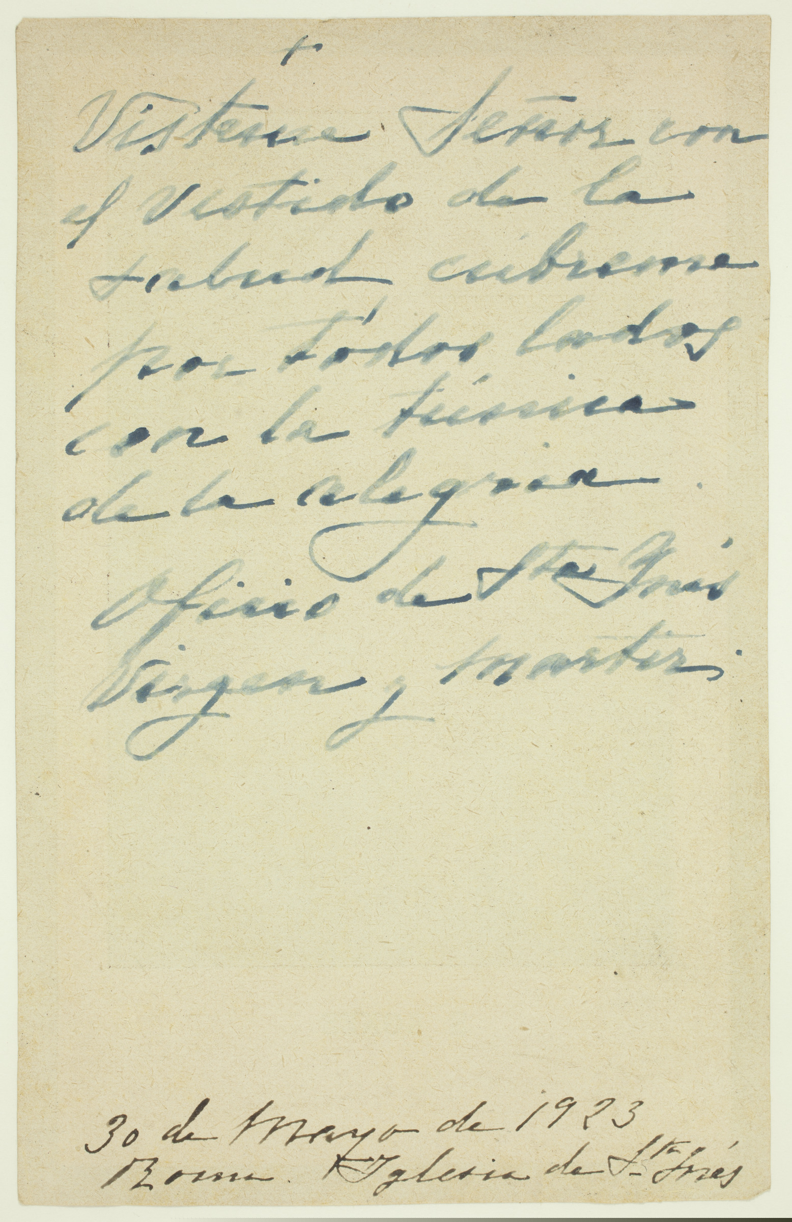 | Irudi erlijiosoa: Santa Inés | Vísteme Señor con el vestido de la salud, cúbreme por todos lados con la túnica de la alegría. Oficio de Sta. Inés, Virgen y Mártir. 30 de mayo de 1923, Roma, Iglesia de Sta. Inés [ms. v.] S. Agnes [imp. r.] |