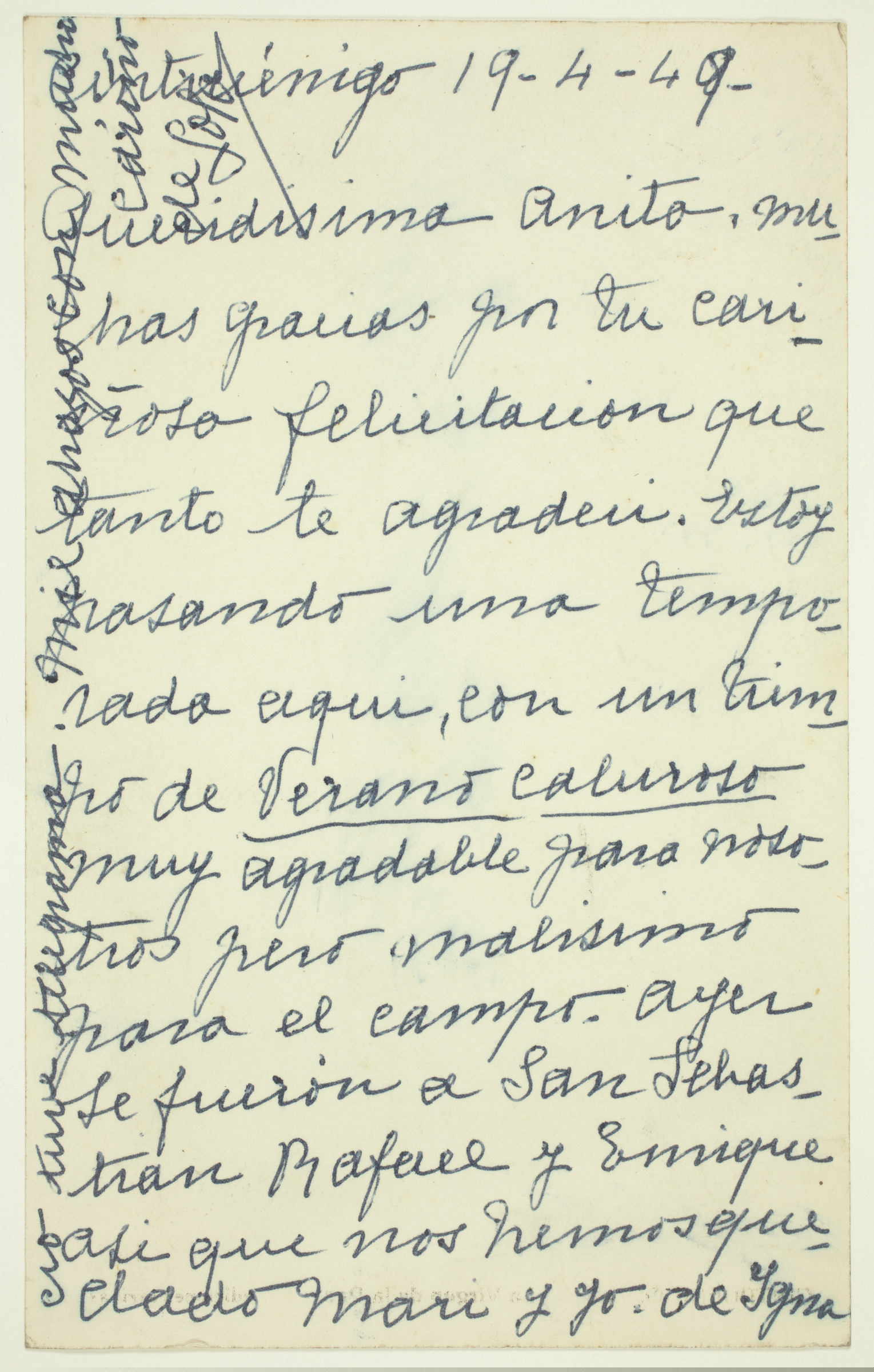 | Irudi erlijiosoa: Ama Birjina | Cintruénigo 19.4.49, Queridísima Anita, muchas gracias por tu cariñosa felicitación que tanto te agradecí. Estoy pasando una temporada aqui, con un tiempo de verano caluroso muy agradable para nosotros pero malísimo para el campo. Ayer se fueron a San Sebastián Rafael y Enrique asi ue nos hemos quedado Mari y yo. de Ignacio tuve telegrama. Mil abrazos con mucho cariño de [sinadura:] Sofía [ms. v.]; Patrona de [ms. r.]; Cintruénigo. 1. La Virgen de la Paz. ediciones arribas |